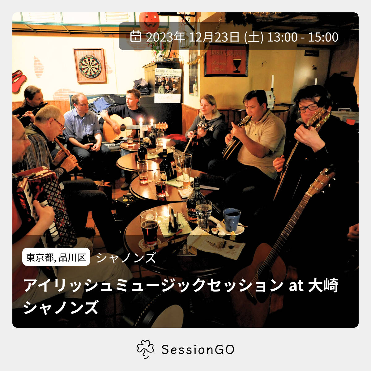 大崎駅から歩いてすぐのアイリッシュパブでアイリッシュミュージックセッションを開催します!どんなレベルの方もご参加いただけます。楽器を演奏される方も音楽を楽しまれる方もお気軽にお越しください。パブセッションデビューの方も大歓迎です。