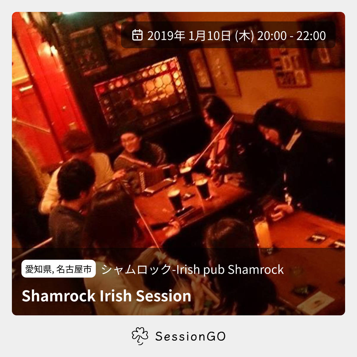 愛知県, 名古屋市シャムロック-Irish pub ShamrockShamrock Irish Session 2019年1月10日(木)終了11:00 - 13:00愛知県名古屋市中区栄1丁目5−14主催者:岩田(フィドル)&服部(コンサーティーナ)🔰 初心者歓迎伏見シャムロックにて1月より、第2木曜定例セッションが始まります 時間:20:00〜22:00 場所:シャムロック(伏見駅6番出口 徒歩30秒) ホスト:岩田、服部 演奏される方は2ドリンク以上のオーダーをお願いします http://shamrock-irishpub.com/イベント内容をコピーして新規投稿※閉店・移転などにより、正常に表示されない場合があります