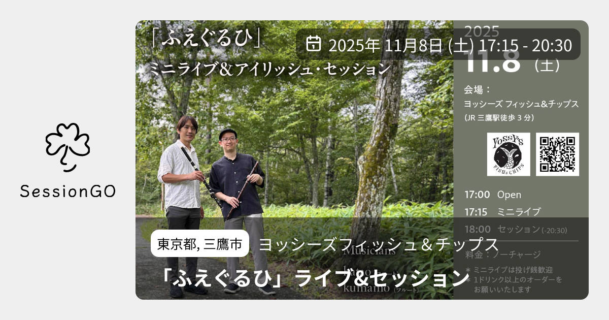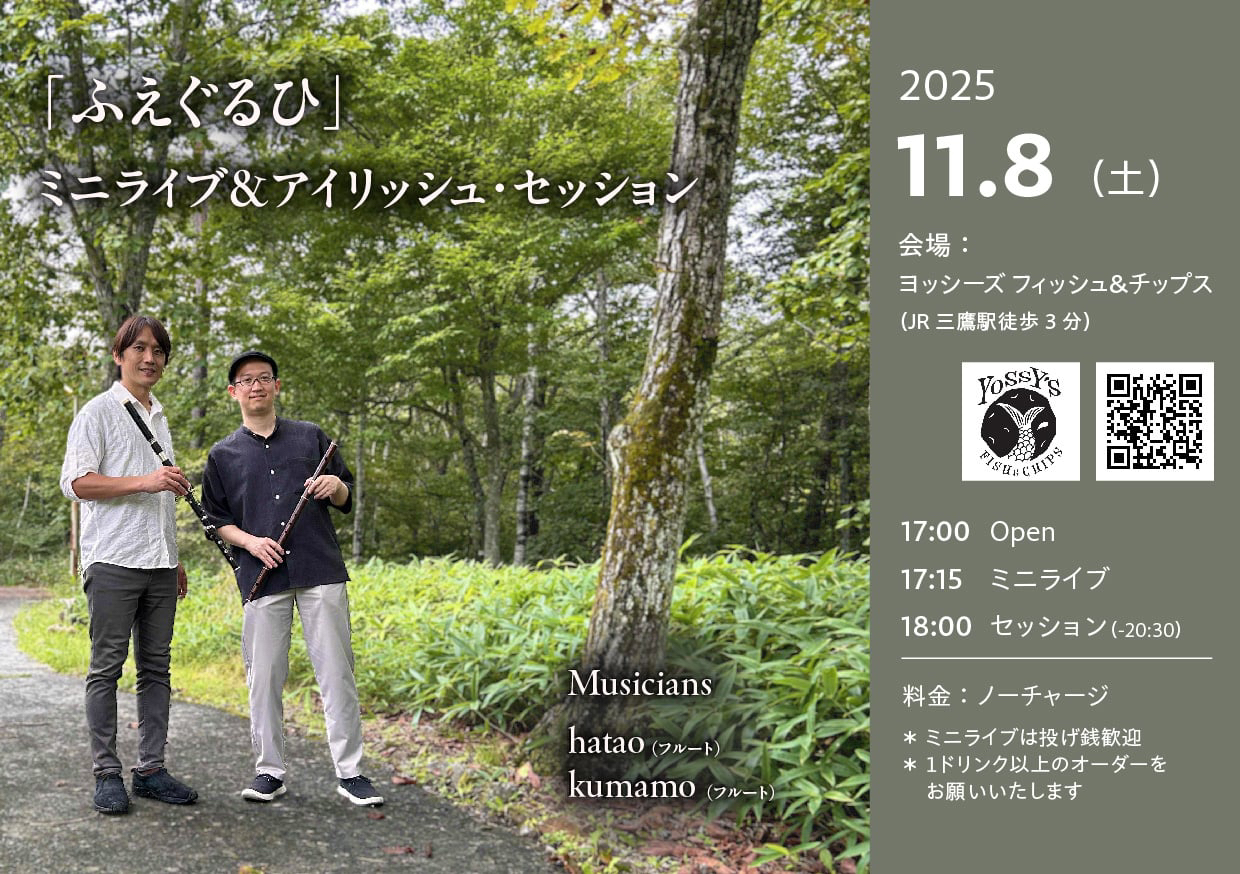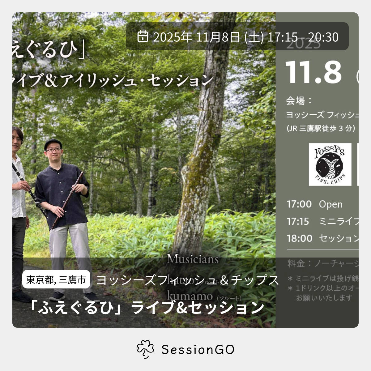 東京都, 三鷹市ヨッシーズフィッシュ&チップス「ふえぐるひ」ライブ&セッション2025年11月8日(土)終了8:15 - 11:30東京都三鷹市下連雀3丁目34−13 内山ビル 2F主催者:hatao & Kumamo🎙️ ライブ🙏 投げ銭お 願いしますアイリッシュ・フルート奏者二人によるミニ・ライブ&アイリッシュ・セッションを開催します。もちろんフルート奏者以外の方のご参加も歓迎します。 イベント内容をコピーして新規投稿参加者✋ 参加予定(0)🤔 行けたら行く(0)👀 興味あり(0)🙅 キャンセル(0)※閉店・移転などにより、正常に表示されない場合があります