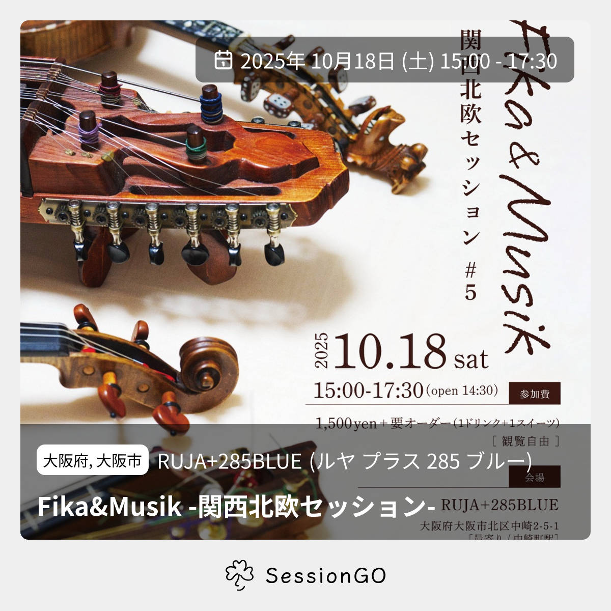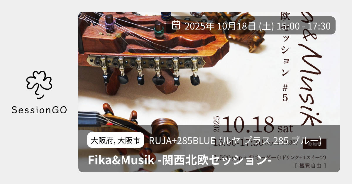 大阪府, 大阪市RUJA+285BLUE (ルヤ プラス 285 ブルー)Fika&Musik -関西北欧セッション-2025年10月18日(土)終了6:00 - 8:30大阪府大阪市北区中崎2丁目5−1主催者:野間 友貴、Lirica、山中 梢💰 参加・チャージ料金が必要北欧の伝統音楽を気軽に楽しむセッションイベント🇸🇪 第5回目の開催です✨ 初参加・見学・観覧だけの方も大歓迎! ーーーーーーーーーーーーーーーーーー 『Fika&Musik -関西北欧セッション-』 日時|10/18(土) 15:00-17:30 (開場 14:30) 会場|RUJA+285BLUE (@ruja_plus_285blue ) 参加費|1,500円+要オーダー (1ドリンク&1スイーツor 2ドリンク) ーーーーーーーーーーーーーーーーーー 最初にアルスペル(みんなで演奏する曲)を演奏して、その後は自由に曲を出し合ってセッションします。 🎵当日演奏するアルスペルの曲 https://docs.google.com/spreadsheets/d/1oE3AUbPjumFP6VpDiNFhatTJTsWB-83Sy6AoAFAHua4/edit?usp=drivesdk (黄色🟨の曲が対象です) 🔗 事前予約がおすすめ https://forms.gle/68xTLfbPBi2C96meA (当日飛び込み参加もOK!) 📩 お問い合わせ fikaandmusik@gmail.comイベント内容をコピーして新規投稿※閉店・移転などにより、正常に表示されない場合があります