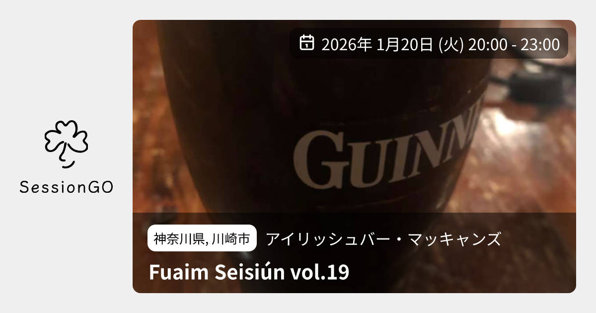 神奈川県, 川崎市アイリッシュバー・マッキャンズFuaim Seisiún vol.192026年1月20日(火)11:00 - 14:00神奈川県川崎市中原区新丸子東2丁目926−27 IRISH BAR McCANN’Sホスト:福島開、大越俊輔、中林亮、内藤徹也 学生時代から仲良くしているメンバーでセッションを開催します(セッション開催を許諾してくださったマッキャンズ様、ありがとうございます)。今回は19回目です。 どなたでも歓迎です。もしよろしければ、ぜひたくさん飲み食いしていってください。 参加予定はこちら▼ https://fb.me/e/6gRmuqUqRイベント内容をコピーして新規投稿※閉店・移転などにより、正常に表示されない場合があります
