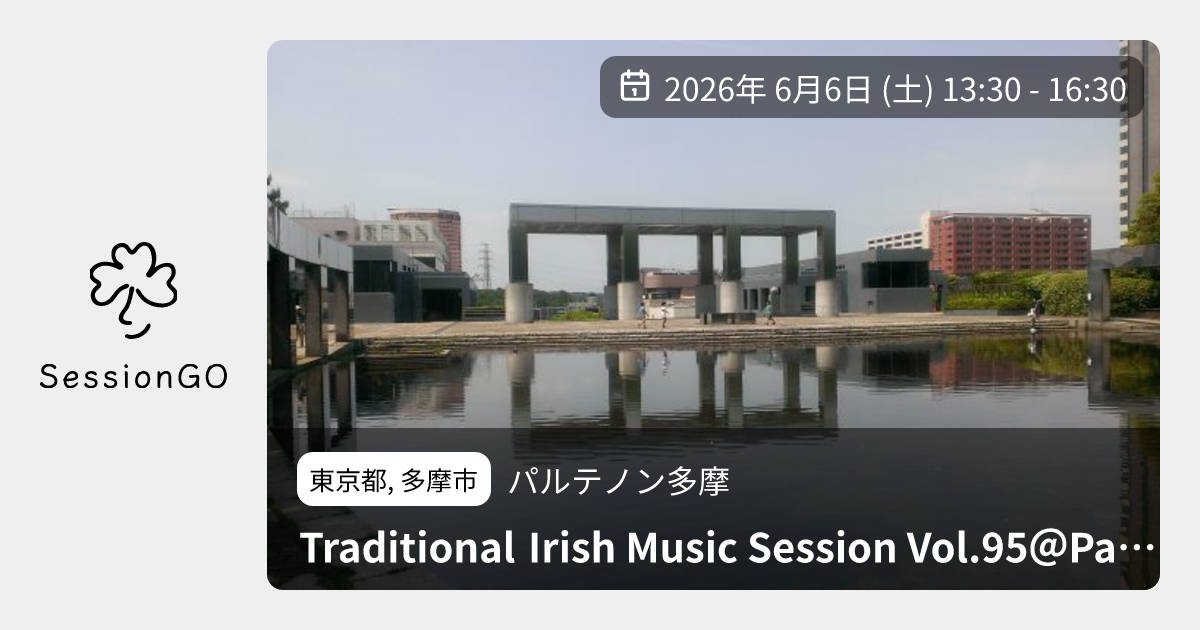 東京都, 多摩市パルテノン多摩Traditional Irish Music Session Vol.95@Parthenon Tama2026年6月6日(土)4:30 - 7:30東京都多摩市落合2丁目35主催者:大橋(Fiddle/ac)袴谷(Flute/ac)🔰 初心者歓迎🚭 開催場所が禁煙💰 参加・チャージ料金が必要💪 練習会Traditional Irish Music Session Vol.95@Parthenon Tama 日時:2026年6月6日(土)13:30-16:30(Open 13:00) 場所:パルテノン多摩第3練習室 多摩センター駅下車徒歩5分 https://www.parthenon.or.jp/ Session host: Ohashi (Fiddle,Accordion) Hakamatani(Flute, Accordion) 参加費:500円(施設利用料等に充てます) 多摩アイルランド伝統音楽練習会ホームページ https://tamairishsession.web.fc2.com/ パルテノン多摩で毎月開催されるアイルランド伝統音楽のセッションです。 都心のパブで行われるセッションに参加するのはまだちょっと気がひけるなあという 初心者の方でも緊張せずに気軽にゆったりとした気持ちで参加できるセッションを目指しています。 イベント内容をコピーして新規投稿※閉店・移転などにより、正常に表示されない場合があります