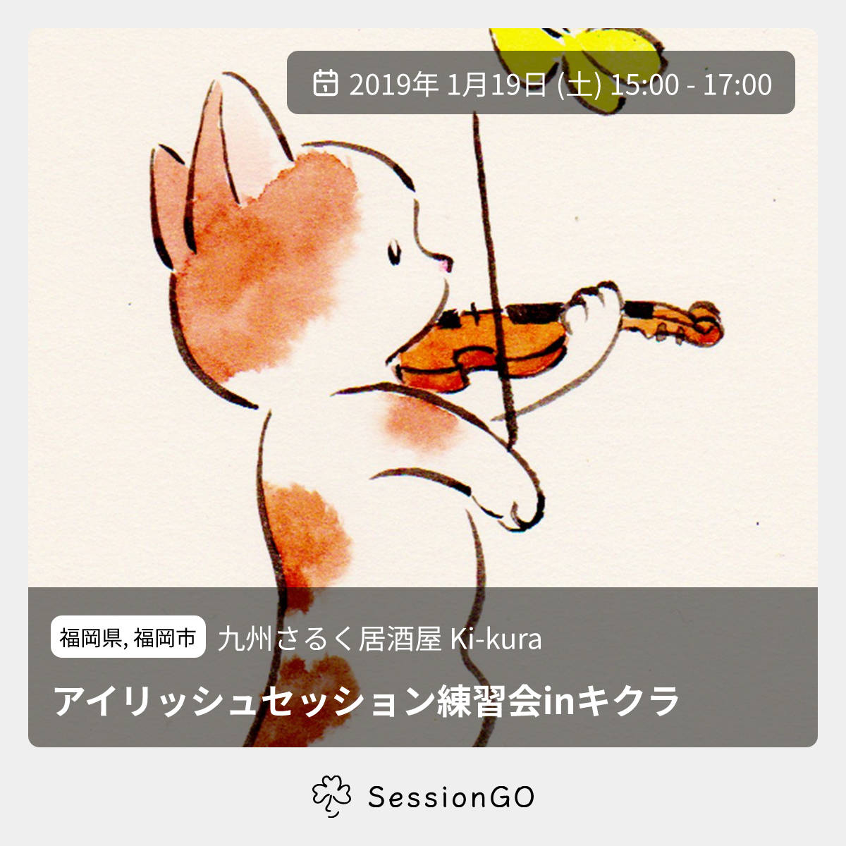 福岡県, 福岡市九州さるく居酒屋 Ki-kuraアイリッシュセッション練習会inキクラ2019年1月19日(土)終了6:00 - 8:00福岡県福岡市博多区博多駅東1丁目1−33🔰 初心者歓迎場所:キクラ 住所:福岡市博多区博多駅東1-1-33 はかた近代ビルB1F 料金:500円(見学の方は無料です)イベント内容をコピーして新規投稿※閉店・移転などにより、正常に表示されない場合があります
