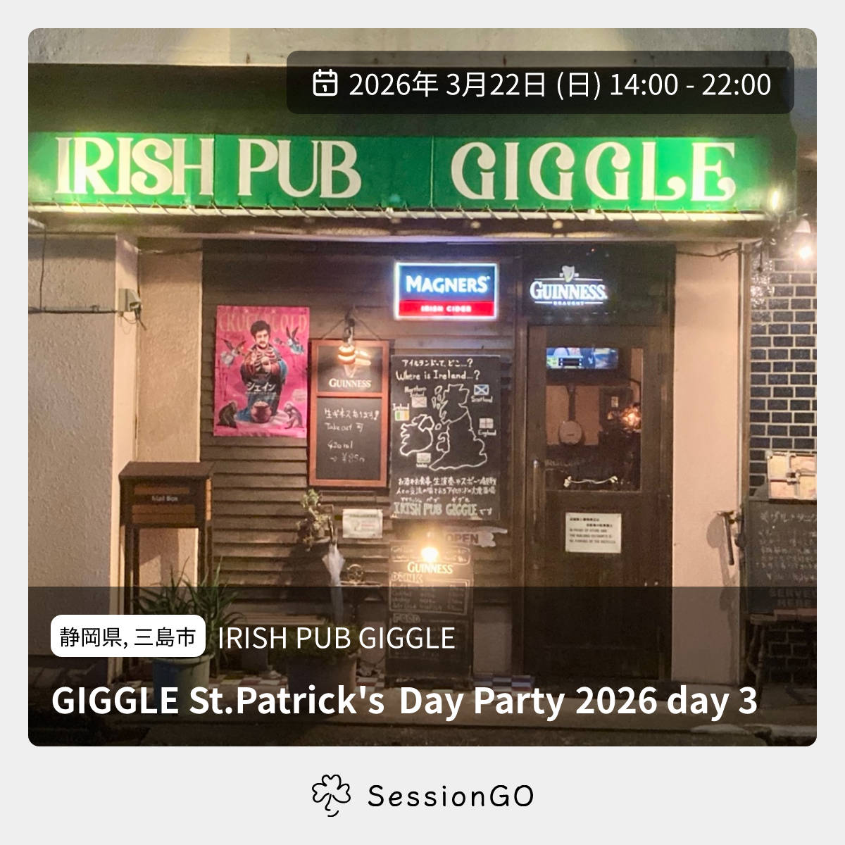 静岡県, 三島市IRISH PUB GIGGLEGIGGLE St.Patrick's Day Party 2026 day 32026年3月22日(日)5:00 - 13:00静岡県三島市西本町10−34主催者:ギグルマスター🎙️ ライブ🔰 初心者歓迎静岡三島アイリッシュパブギグルでの、セントパトリクスデーイベント最終日です。 ギグルギグの大先輩バンドGUINNESS BORRACHOと、地元メンバーの練習会チームのLIVEあります。 空いている時間はセッションタイムになりますので、三連休最終日たくさんの参加をお待ちしております♬イベント内容をコピーして新規投稿※閉店・移転などにより、正常に表示されない場合があります