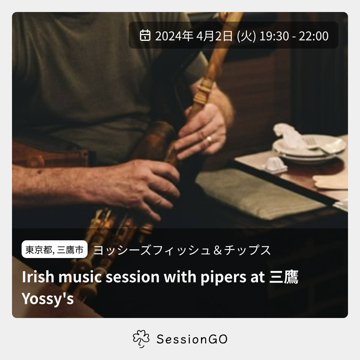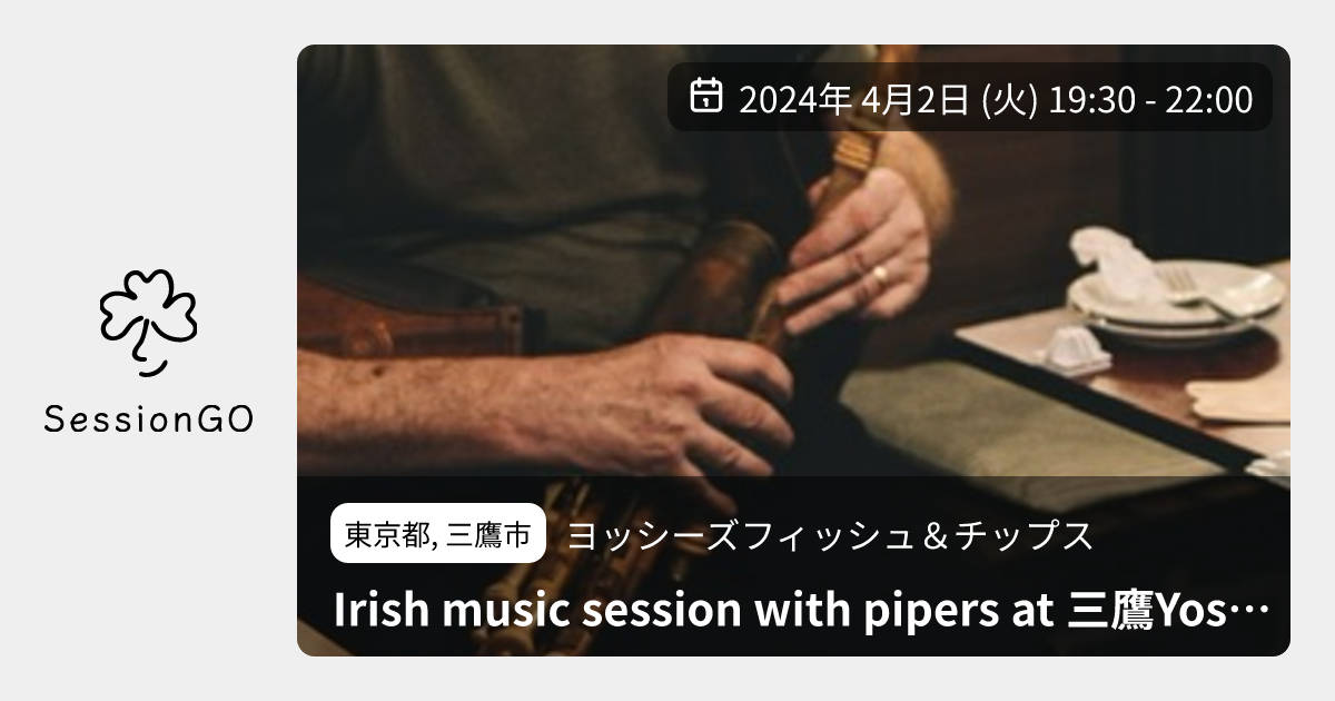 東京都, 三鷹市ヨッシーズフィッシュ&チップスIrish music session with pipers at 三鷹Yossy's2024年4月2日(火)終了10:30 - 13:00東京都三鷹市下連雀3丁目34−14主催者:Taka Uchino4/2(火)19:30〜三鷹ヨッシーズにて ホスト:内野貴文 イーリアンパイプスが少し多めのセッションを開催します。 アメリカからのゲストパイパーJonathan Warnerさんも参加予定。もちろんパイプ以外の楽器奏者の方も大歓迎です。飲むだけの方も是非。イベント内容をコピーして新規投稿※閉店・移転などにより、正常に表示されない場合があります