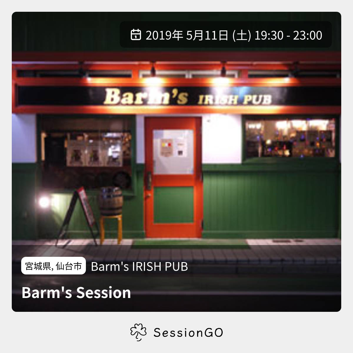宮城県, 仙台市Barm's IRISH PUBBarm's Session2019年5月11日(土)終了10:30 - 14:00宮城県仙台市青葉区五橋2丁目11−13主催者:TRAD(http://irish.chips.jp/)🚭 開催場所が禁煙アイリッシュだけではなく、ケープブレトン、スコティッシュも出るアットホームなSessionです。 元大手ビール醸造責任者のマスターが注ぐGUINNESSも絶品!まずはお気軽に聴きに、飲みにお越し下さい。イベント内容をコピーして新規投稿※閉店・移転などにより、正常に表示されない場合があります