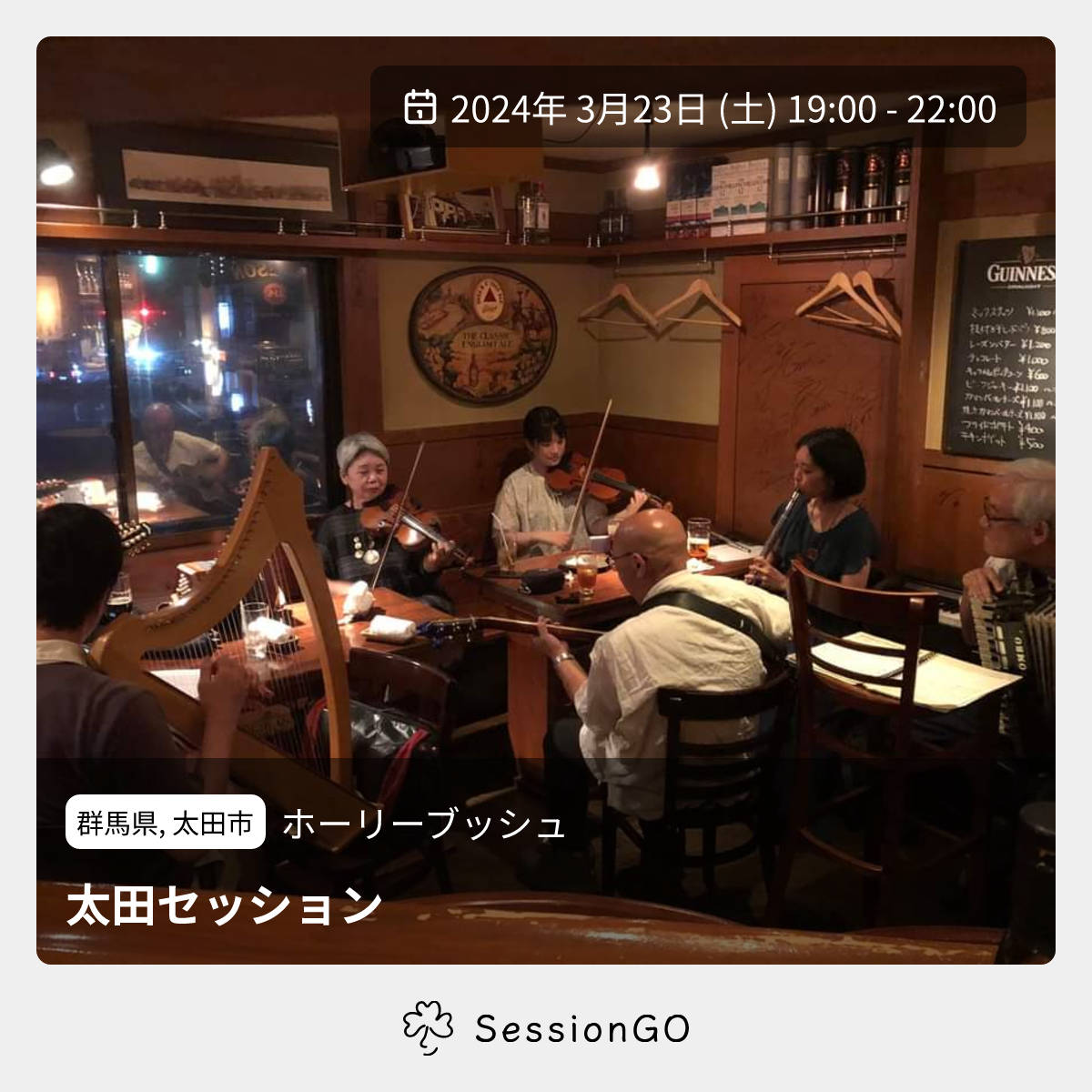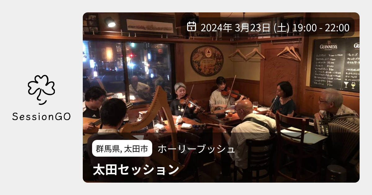 群馬県, 太田市ホーリーブッシュ太田セッション2024年3月23日(土)終了10:00 - 13:00群馬県太田市飯田町1358−1主催者:アイルランド音楽サークル【カパルトーン】🔰 初心者歓迎【日時】 3/23(土) 19時〜22時予定 【場所】 ホーリーブッシュ 群馬県太田市飯田町1360 ・参加者も見学者もお店に1ドリンク注文をお願いします。 ・参加者はアイルランド音楽に使用される楽器をご持参下さい。 ・セントパトリックスデーセッションということで、ぜひ緑色のものを身につけてきていらしてください♪ ホストはアイルランド音楽サークル【カパルトーン】のメンバーです。初心者の方も知っている曲だけ参加という形で参加できます。ぜひお気軽にいらして下さい。 アイルランド音楽サークル【カパルトーン】 Facebookページ https://www.facebook.com/IrishGunmaイベント内容をコピーして新規投稿※閉店・移転などにより、正常に表示されない場合があります