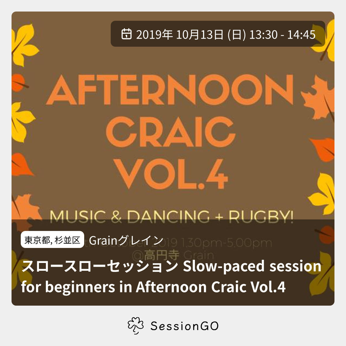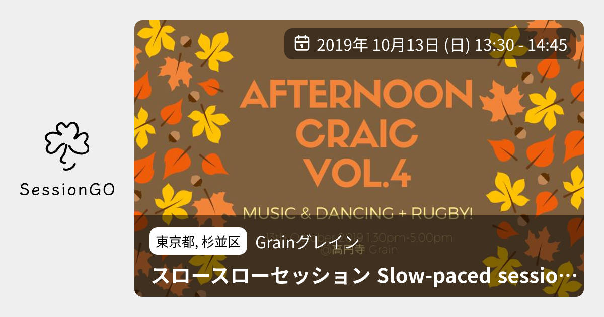 東京都, 杉並区Grainグレインスロースローセッション Slow-paced session for beginners in Afternoon Craic Vol.42019年10月13日(日)終了4:30 - 5:45東京都杉並区高円寺北3丁目22−5主催者:CCÉ Japan🔰 初心者歓迎初心者大歓迎!課題曲なし、当日の皆さんのリクエストを踏まえてゆっくり進行するセッションです。ポルカ、ジグ、エアーを中心に取り上げる予定です。 https://comhaltas.jp/event/afternoon-craic-vol-4-%e9%ab%98%e5%86%86%e5%af%bagrain https://www.facebook.com/events/444058899541747/ ※台風の影響で中止や延期になる可能性がございます。公式サイトの情報の確認をお願いします。イベント内容をコピーして新規投稿※閉店・移転などにより、正常に表示されない場合があります