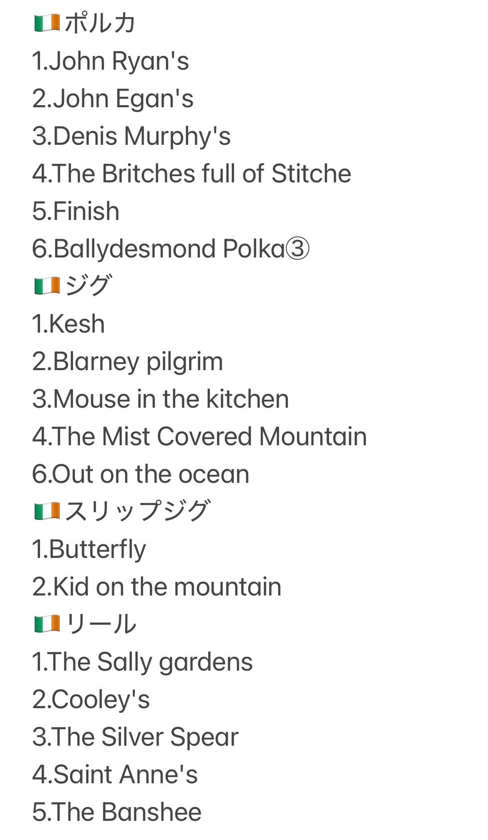(例)ポルカ、ジグ、スリップジグ、リール、ホーンパイプ、ワルツ、エアなど