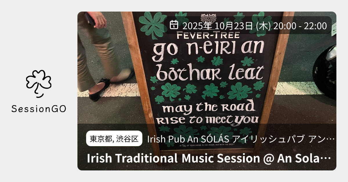 このイベントは終了していますが、同じ場所でこんなイベントも予定されています2026/3/18(水)10:30-13:00Gan Ainm Session at Yoyogi An Solas東京渋谷区Irish Pub An SÓLÁS アイリッシュパブ アン ソラス2026/3/24(火)10:00-13:00Irish Music Session Vol.171 at Yoyogi Tokyo東京渋谷区Irish Pub An SÓLÁS アイリッシュパブ アン ソラス2026/4/28(火)10:00-13:00Irish music Session Vol.172 at Yoyogi, Tokyo東京渋谷区Irish Pub An SÓL ÁS アイリッシュパブ アン ソラス2026/5/26(火)10:00-13:00Irish Music Session Vol.173 at Yoyogi, Tokyo東京渋谷区Irish Pub An SÓLÁS アイリッシュパブ アン ソラス東京都, 渋谷区Irish Pub An SÓLÁS アイリッシュパブ アン ソラスIrish Traditional Music Session @ An Solas (アイリッシュ音楽セッション @ アンソラス)2025年10月23日(木)終了11:00 - 13:00東京都渋谷区千駄ケ谷5丁目22−3 都営千駄ヶ谷アパート 1号館 103号🔰 初心者歓迎【アイリッシュ音楽セッションのお知らせ】 日時: 2025年10月23日(木) 20:00~22:00 場所: Irish Pub An SÓLÁS (アイリッシュパブ アン ソラス) 住所: 東京都渋谷区千駄ヶ谷5-22-3 都営住宅千駄ヶ谷アパート1号館103号 電話: 03-5919-6686 https://instagram.com/an_solas/ 自由参加のオープンセッションです。イベント内容をコピーして新規投稿