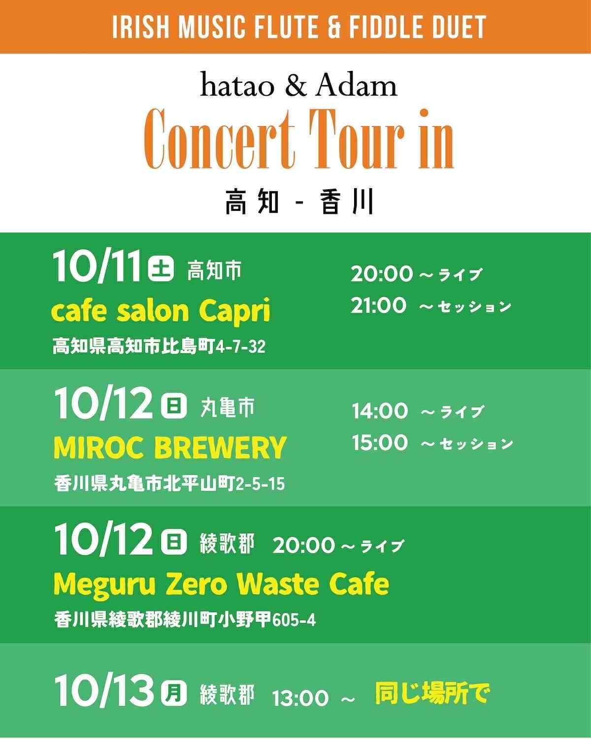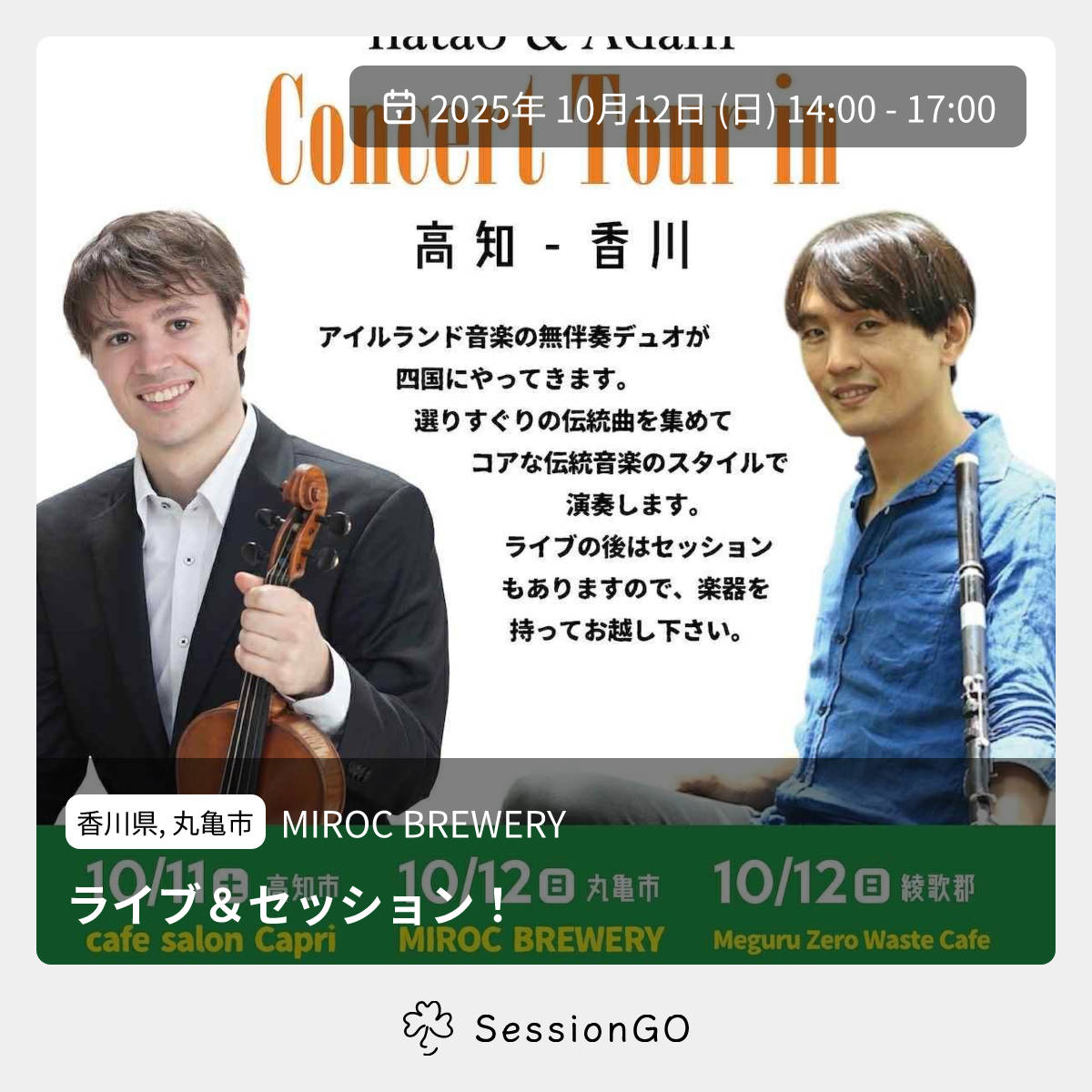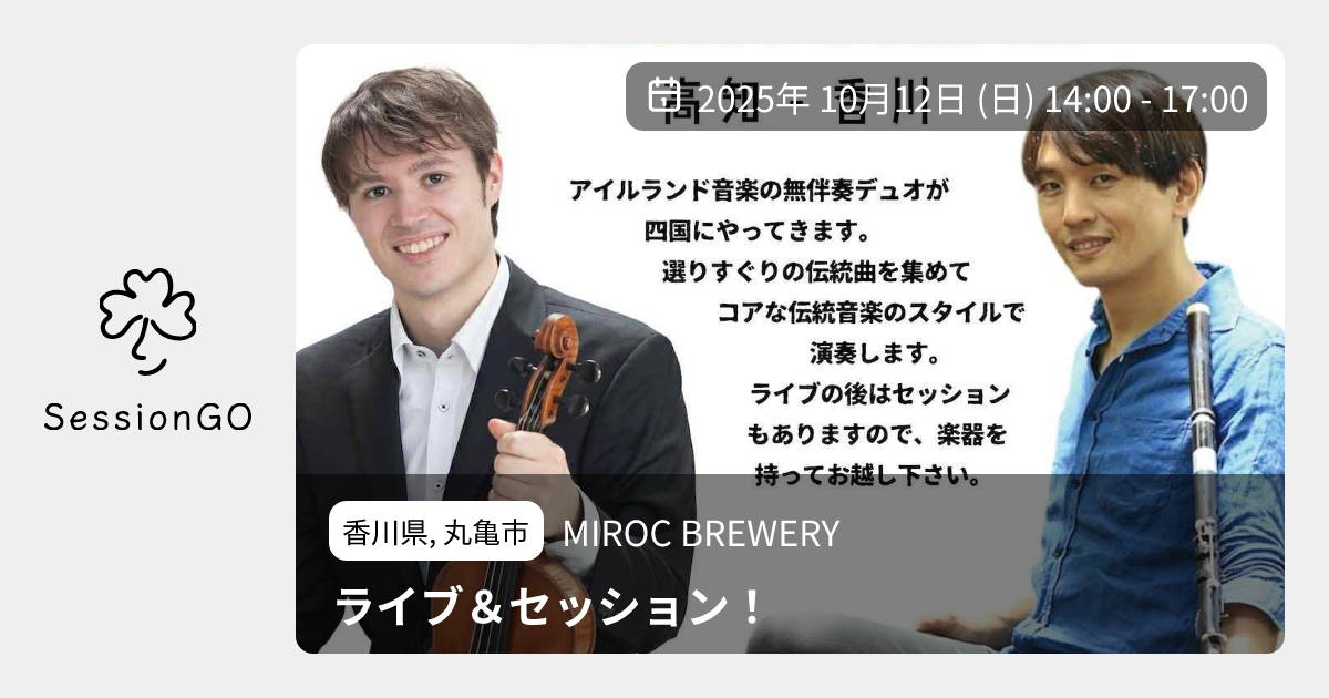 香川県, 丸亀市MIROC BREWERYライブ&セッション!2025年10月12日(日)終了5:00 - 8:00香川県丸亀市北平山町2丁目5−15主催者:Hatao&Adam🎙️ ライブ🙏 投げ銭お願いします地ビールを造られている、Mirocビールさんで 14時から1時間 hatao&Adam投げ銭ライブ 15時から2時間 セッション です!駅チカなので、電車でお越しください! 地ビールとライブ&セッションを楽しみましょう! 同日20時からと13日めぐるカフェさんでhatao&Adamライブもあります!! イベント内容をコピーして新規投稿※閉店・移転などにより、正常に表示されない場合があります