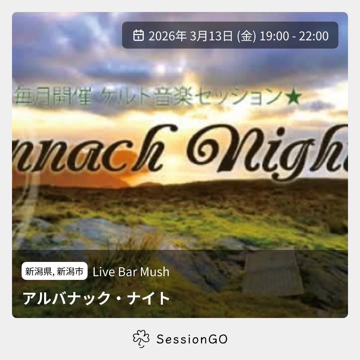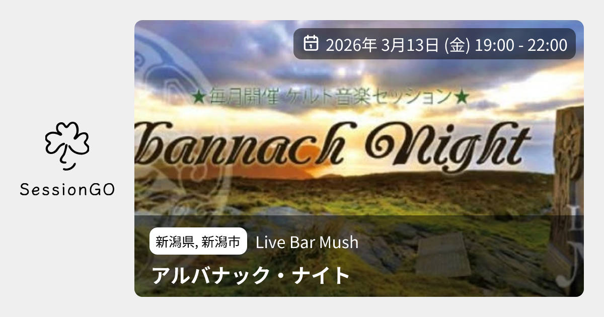 新潟県, 新潟市Live Bar Mushアルバナック・ナイト2026年3月13日(金)10:00 - 13:00新潟県新潟市中央区西堀通8番町1579−1主催者:Craic (バンド)🔰 初心者歓迎毎月開催 ケルト音楽セッション 楽器持参でお気軽にご参加ください🍀 アイリッシュ音楽に興味ある方もイベント内容をコピーして新規投稿参加者✋ 参加予定(0)🤔 行けたら行く(0)👀 興味あり(0)🙅 キャンセル(0)※閉店・移転などにより、正常に表示されない場合があります