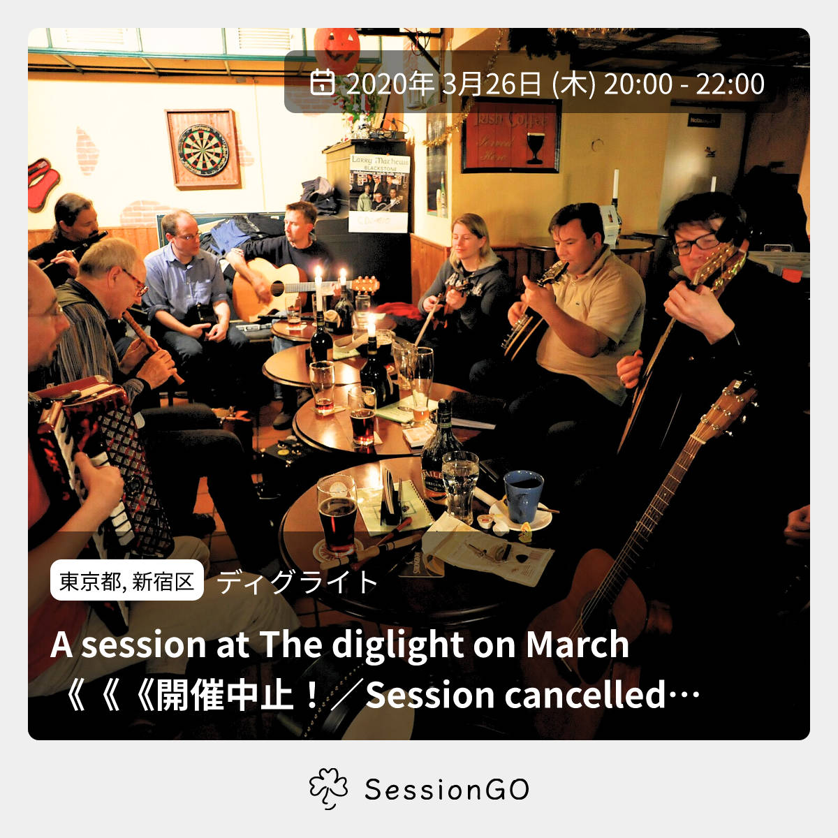 東京都, 新宿区ディグライトA session at The diglight on March 《《《開催中止!/Session cancelled!!》》》2020年3月26日(木)終了11:00 - 13:00東京都新宿区高田馬場2丁目1−2主催者:The Minami-Urawa Ceili Band🔒 クローズドセッション🔰 初心者歓迎🚭 開催場所が禁煙🙋♀️ 事前申し込みが必要《《《《情勢の変化を踏まえ、開催中止します》》》》 《《《《Session cancelled!!》》》》 時勢を鑑み、「密閉・密集・密接」を慎重に避けて、開催します。 ご興味のある方はセッション・ホストまでご相談ください。イベント内容をコピーして新規投稿※閉店・移転などにより、正常に表示されない場合があります