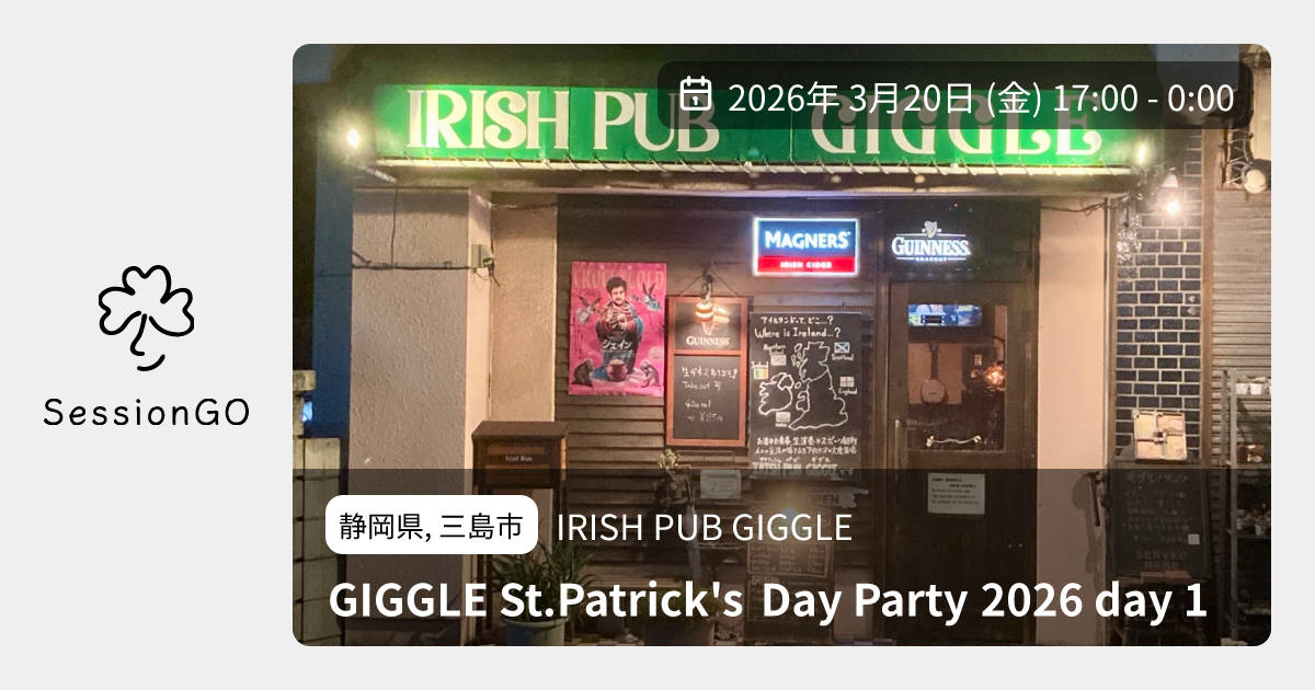 静岡県, 三島市IRISH PUB GIGGLEGIGGLE St.Patrick's Day Party 2026 day 12026年3月20日(金)8:00 - 15:00静岡県三島市西本町10−34主催者:南浦和ケーリーバンド🎙️ ライブ静岡三島アイリッシュパブギグルでの、セントパトリクスデーイベント1日目です。 この時期に何度かギグルに来ている、南浦和ケーリーバンドの皆さんがホスト役です。 三連休初日、是非たくさんの参加をお待ちしております♬イベント内容をコピーして新規投稿※閉店・移転などにより、正常に表示されない場合があります
