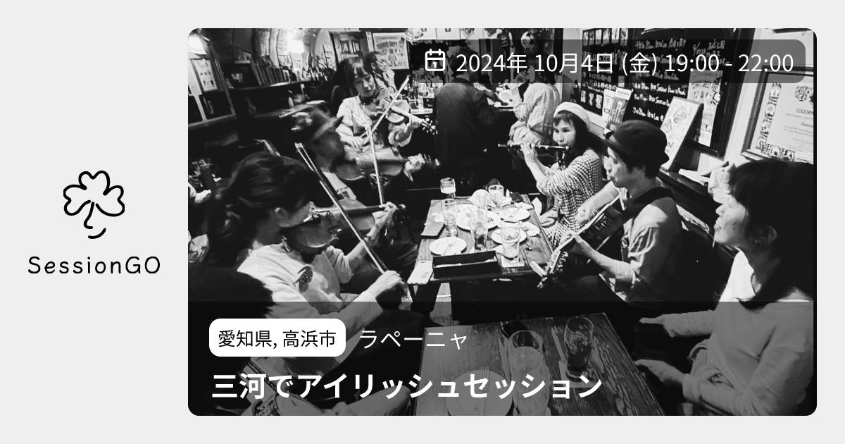 愛知県, 高浜市ラペーニャ三河でアイリッシュセッション2024年10月4日(金)終了10:00 - 13:00愛知県高浜市小池町5丁目5−7主催者:sue-young-island🙋♀️ 事前申し込みが必要🔰 初心者歓迎💰 参加・チャージ料金が必要愛知県三河初?アイリッシュセッションを行います 人数に限りがある為、事前申し込み制とさせていただきます。 【場所】 スペインバル『La Peña (ラペーニャ)』 (愛知県高浜市小池町5-5-6) 【参加代(飲食代)】 1ドリンク、1プレート(スウィーツかタパスなど)¥1.500 【参加人数】 最大12名 イベント内容をコピーして新規投稿参加者✋ 参加予定(0)🤔 行けたら行く(0)👀 興味あり(0)🙅 キャンセル(0)※閉店・移転などにより、正常に表示されない場合があります