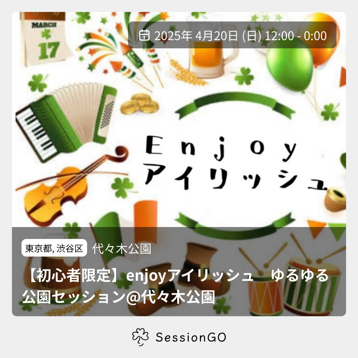 東京都, 渋谷区代々木公園【初心者限定】enjoyアイリッシュ ゆるゆる公園セッション@代々木公園2025年4月20日(日)終了3:00 - 15:00東京都渋谷区代々木神園町2−1🔰 初心者歓迎🙋♀️ 事前申し込みが必要4/20(日)代々木公園でアイリッシュ音楽のゆっくりゆったりゆるゆるセッションをする予定です🇮🇪 ご興味ある方は X または ジモティからお問い合わせください!! 事前に演奏予定の曲はお伝えいたします! ※速い演奏はNGですのでご了承ください。 主催者は初心者です。ご了承ください。 X : https://x.com/kuro150/status/1899591402558001544?s=46 ジモティ: https://jmty.jp/tokyo/com-spo/article-1fyxgeイベント内容をコピーして新規投稿※閉店・移転などにより、正常に表示されない場合があります