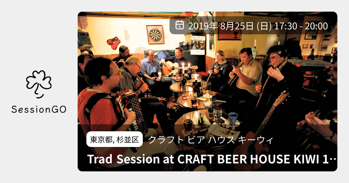 東京都, 杉並区クラフト ビア ハウス キーウィTrad Session at CRAFT BEER HOUSE KIWI 15th2019年8月25日(日)終了8:30 - 11:00東京都杉並区高井戸東2丁目26−3主催者:和泉(Flute,Whistle) /福井(Fiddle)🔰 初心者歓迎🙋♀️ 事前申し込みが必要8月25日(日)に「CRAFT BEER HOUSE KIWI」にてセッションを開催いたします。 どうぞビールを飲みに来てください。 参加の方はボタンをポチっと押してください。 アイリッシュ中心の進行になるかと思いますが、他のトラッドも歓迎いたします。 Host // 和泉(Flute,Whistle) /福井(Fiddle) 日時 //8月25日(日) 17:30~20:00 場所 //「CRAFT BEER HOUSE KIWI」 http://kou-ogata.net/?page_id=253 京王井の頭線「高井戸駅」より徒歩3分 料金 // ミュージックチャージフリー お通し付きチャージ200円+ワンドリンクオーダー フードもおいしいので夕飯もぜひ!! 参加方法//人数把握のためにFacebookイベントページ(https://www.facebook.com/events/603508876808883/)の参加ボタン押下かホストまでお声がけください。イベント内容をコピーして新規投稿※閉店・移転などにより、正常に表示されない場合があります