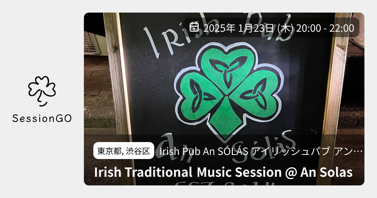 東京都, 渋谷区Irish Pub An SÓLÁS アイリッシュパブ アン ソラスIrish Traditional Music Session @ An Solas2025年1月23日(木)終了11:00 - 13:00東京都渋谷区千駄ケ谷5丁目22−3 都営千駄ヶ谷アパート 1号館 103号主催者:LIM🔰 初心者歓迎自由参加のオープンセッションです。イベント内容をコピーして新規投稿※閉店・移転などにより、正常に表示されない場合があります