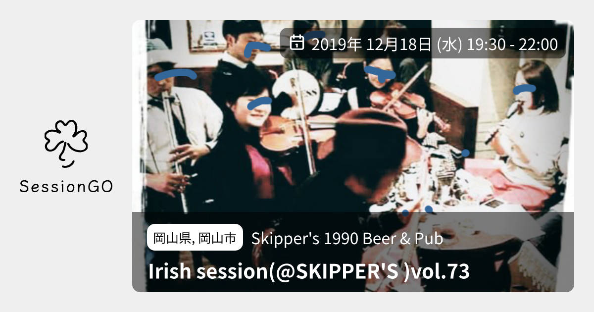 岡山県, 岡山市Skipper's 1990 Beer & PubIrish session(@SKIPPER'S )vol.732019年12月18日(水)終了10:30 - 13:00岡山県岡山市北区田町1丁目1−3主催者:leaprick🚭 開催場所が禁煙celtic christmas session! イベント内容をコピーして新規投稿※閉店・移転などにより、正常に表示されない場合があります