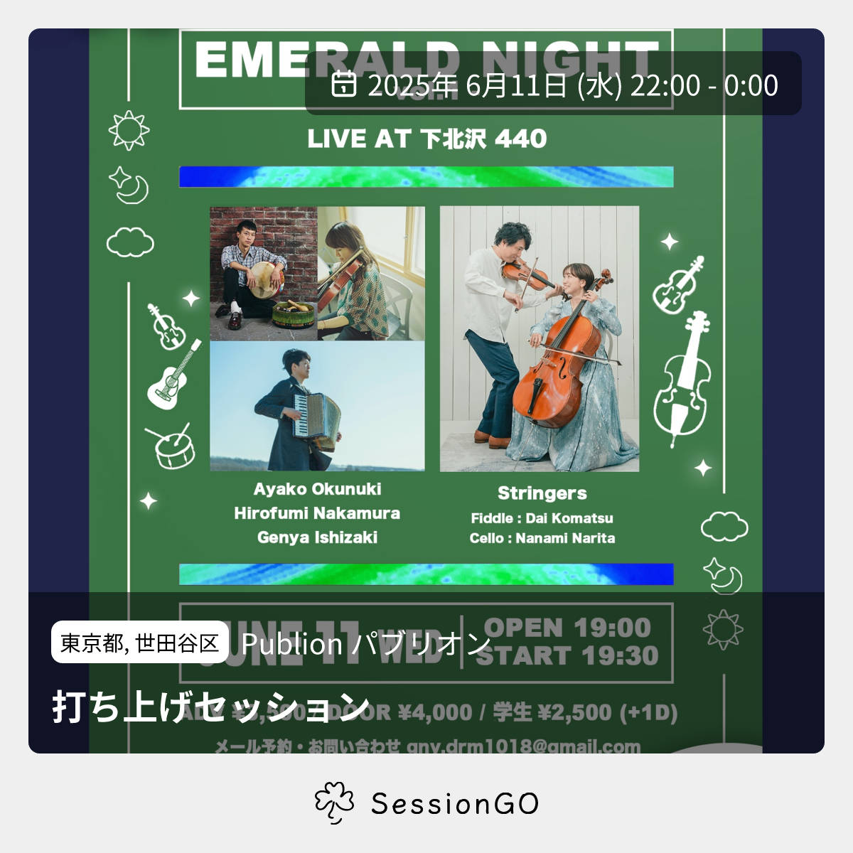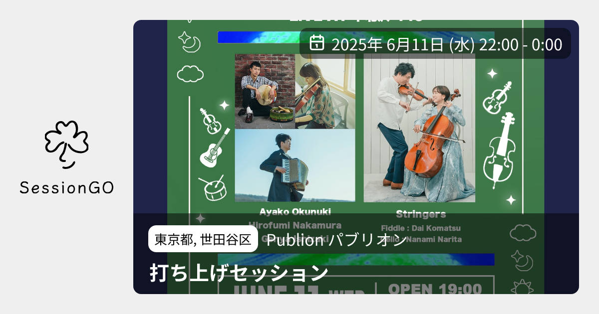 東京都, 世田谷区Publion パブリオン打ち上げセッション2025年6月11日(水)終了13:00 - 15:00東京都世田谷区北沢2丁目32−6 新力ビル 2F主催者:石崎元弥🚭 開催場所が禁煙下北沢440で開催されるLIVEの打ち上げセッションです! どなたでもご参加いただけますので、お気軽にお立ち寄りください🙆♂️ ライブも宜しければぜひ✨↓ https://eplus.jp/sf/detail/4310170001-P0030001イベント内容をコピーして新規投稿※閉店・移転などにより、正常に表示されない場合があります