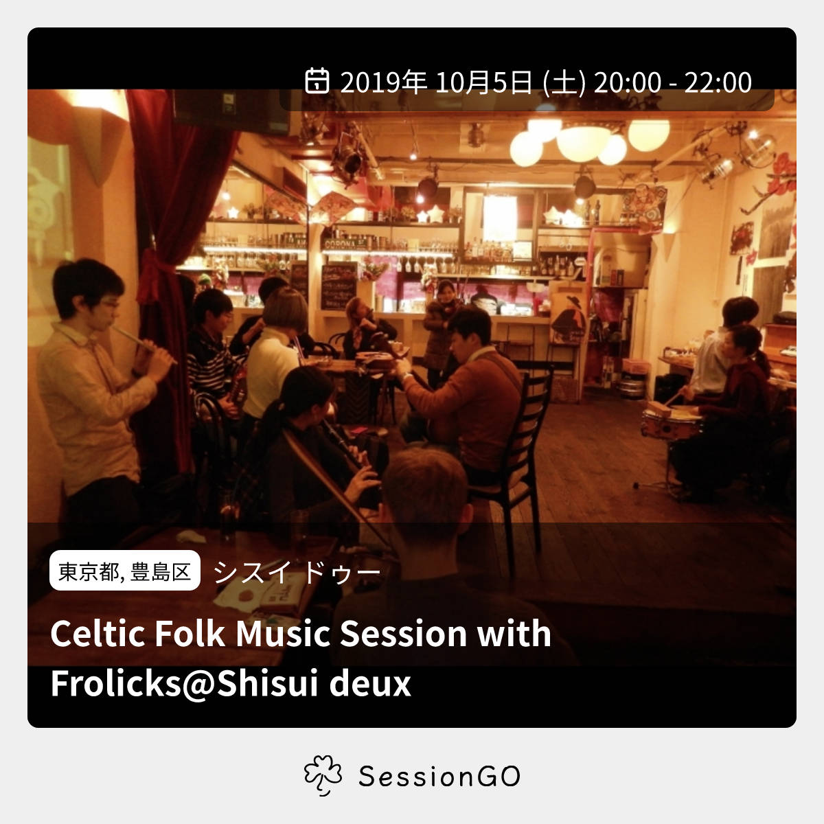 このイベントは終了していますが、同じ場所でこんなイベントも予定されています2026/4/12(日)9:00-12:00Celtic Folk Music Session @Shisui Deux(大塚)東京豊島区シスイ ドゥー東京都, 豊島区シスイ ドゥーCeltic Folk Music Session with Frolicks@Shisui deux2019年10月5日(土)終了11:00 - 13:00東京都豊島区南大塚1丁目60−20主催者:Ryza, Izumi, Hakama🔰 初心者歓迎Celtic Folk Music Session with Frolicks @大塚シスイドゥー 日時:10月5日(土) 20時から~ 場所:Shisui deux (大塚駅から徒歩2分。池袋駅からJR山手線で一駅です。) https://www.facebook.com/Shisuideux/ 「大塚ケルティックプロジェクト2019」 初の土曜日開催ということで、 今回はFrolicksスペシャル! ライブ帰りの3人がセッションホストを努めます。 同日夕方、大塚からも近い十条駅前のビール屋さんで16:00-17:00の間演奏してますので、よかったらそちらも覗きに来てくださいね。 https://www.facebook.com/events/368587530734418/?ti=cl うた歓迎!ダンスOK! ワインもギネスもお酒各種そろってます。イベント内容をコピーして新規投稿※閉店・移転などにより、正常に表示されない場合があります