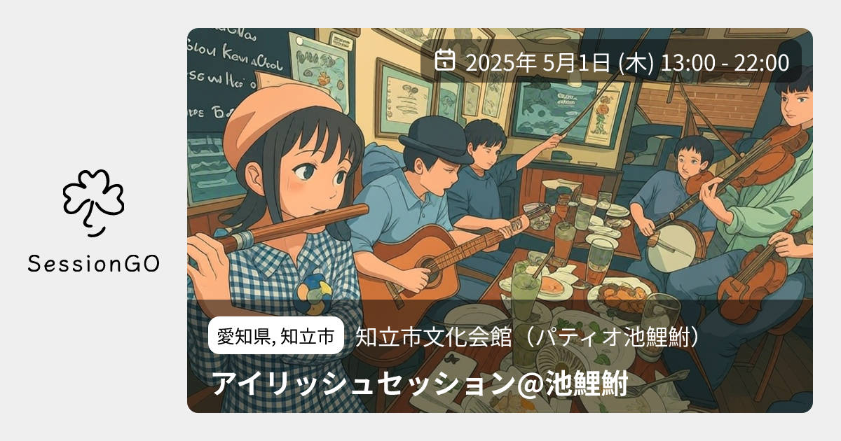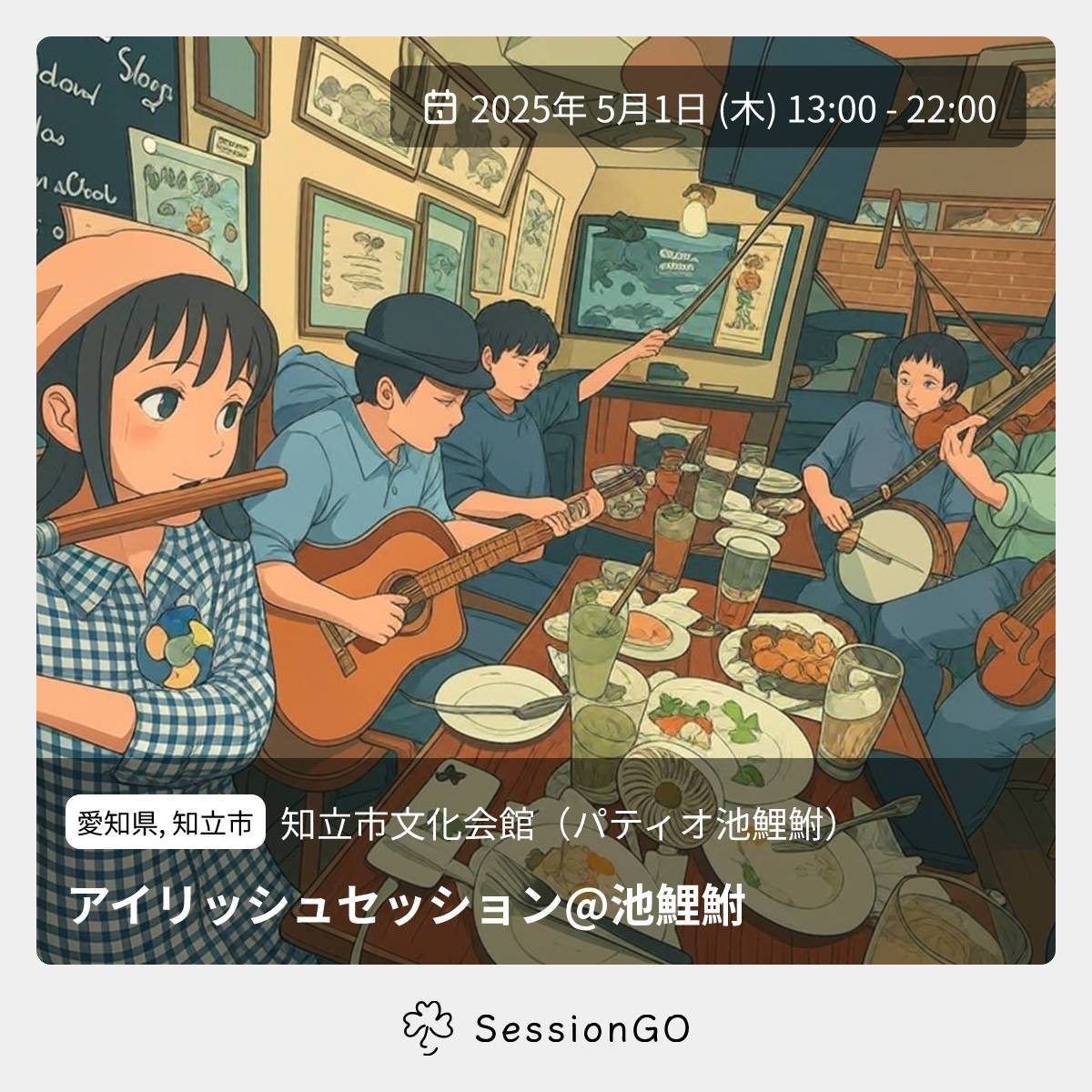 愛知県, 知立市知立市文化会館(パティオ池鯉鮒)アイリッシュセッション@池鯉鮒2025年5月1日(木)終了4:00 - 13:00愛知県知立市上重原町間瀬口116主催者:suzukitomoyuki🔰 初心者歓迎愛知県知立市でアイリッシュセッションします 東海道五十三次 39番目の宿場町池鯉鮒(現 知立)にあるパティオ池鯉鮒リハーサル室3にて行います。 時間長いですが、出入り自由となってます。お気軽に参加してください。 初心者歓迎🔰イベント内容をコピーして新規投稿※閉店・移転などにより、正常に表示されない場合があります