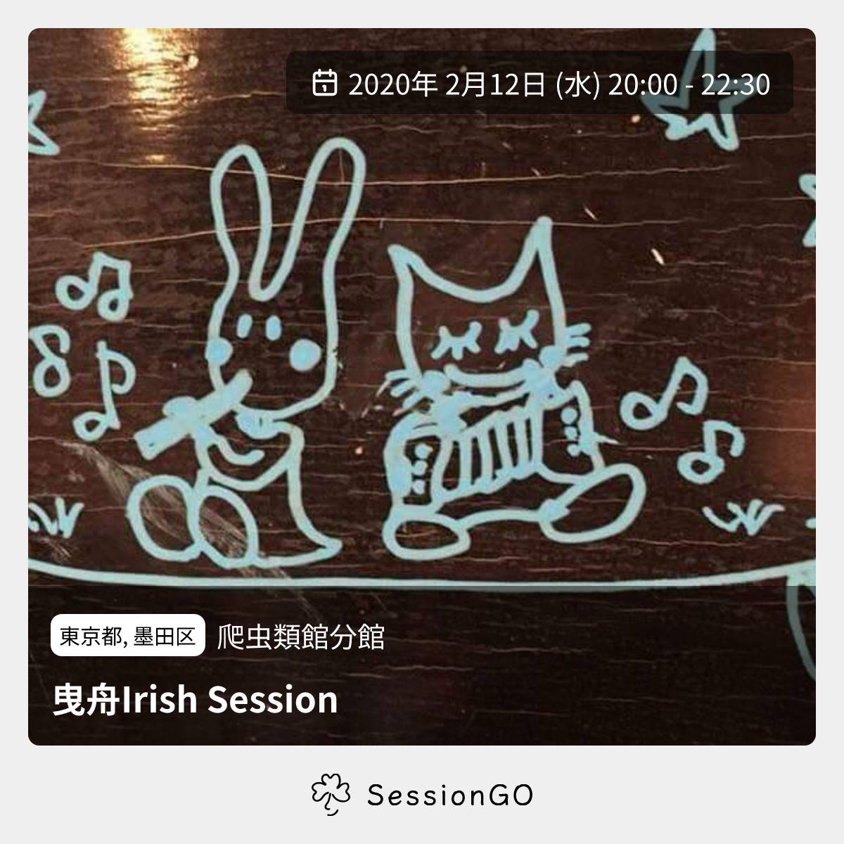 東京都, 墨田区爬虫類館分館曳舟Irish Session2020年2月12日(水)終了11:00 - 13:30東京都墨田区京島3丁目19−3🔰 初心者歓迎🚭 開催場所が禁煙セッション20時〜イベント内容をコピーして新規投稿※閉店・移転などにより、正常に表示されない場合があります