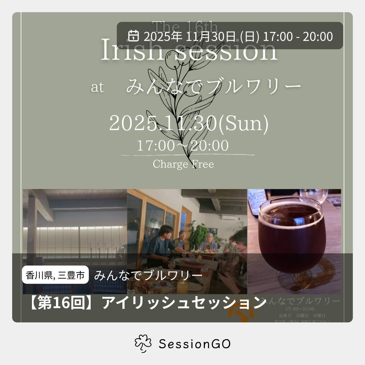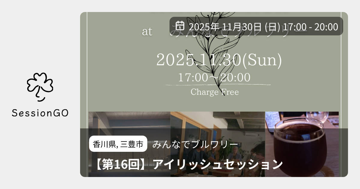 香川県, 三豊市みんなでブルワリー【第16回】アイリッシュセッション2025年11月30日(日)終了8:00 - 11:00香川県三豊市仁尾町仁尾丁198−1主催者:吉家🍻✨ The 16th Irish Session at みんなでブルワリー! みんなで集まって、アイリッシュミュージックのセッションを楽しもう♪ ビール片手にリラックスした夜を過ごせます。 日時: 2025年11月30日(日) 17:00〜20:00 場所: みんなでブルワリー (香川県三豊市仁尾町仁尾丁198) チャージ無料! 誰でも参加OKです。お友達誘って来てね!イベント内容をコピーして新規投稿※閉店・移転などにより、正常に表示されない場合があります