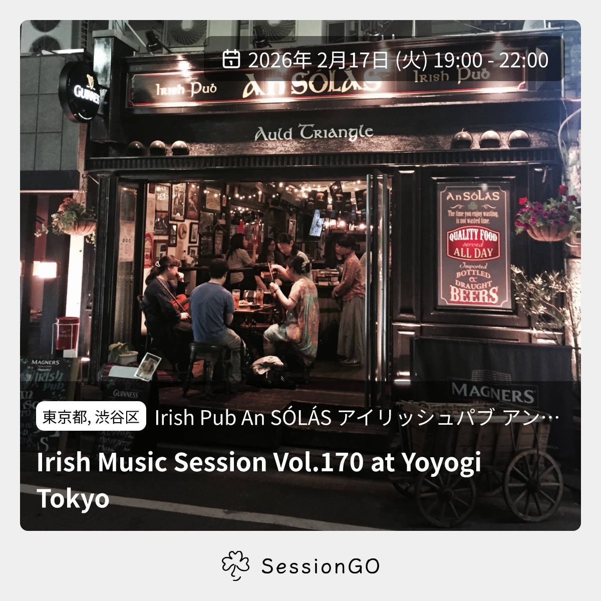 東京都, 渋谷区Irish Pub An SÓLÁS アイリッシュパブ アン ソラスIrish Music Session Vol.170 at Yoyogi Tokyo2026年2月17日(火)10:00 - 13:00東京都渋谷区千駄ケ谷5丁目22−3 都営千駄ヶ谷アパート 1号館 103号主催者:Hiroshi Hasegawa🔰 初心者歓迎🚭 開催場所が禁煙代々木のアイリッシュパブ「An SÓLÁS(アンソラス)」のセッションのご案内です。皆様の参加・ご来店をお心より待ちしております。イベント内容をコピーして新規投稿※閉店・移転などにより、正常に表示されない場合があります