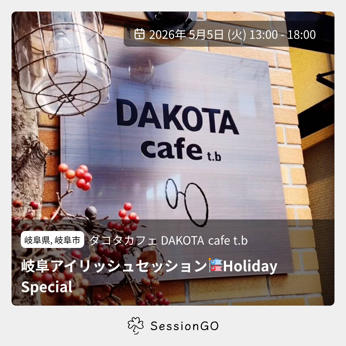 岐阜県, 岐阜市ダコタカフェ DAKOTA cafe t.b岐阜アイリッシュセッション🎏Holiday Special2026年5月5日(火)4:00 - 9:00岐阜県岐阜市清住町1丁目 6−2 2階主催者:すて (ButtonAccordion/Fiddle)🔰 初心者歓迎岐阜駅近くのカフェ DAKOTA cafe t.b にて、定期開催しているアイリッシュセッションです。 5月は、祝日にあたりましたので、いつもは夜スタートなところを、この日は昼過ぎから始めます。 普段は遠くて来れない方もこの機会にぜひご参加くださいませ! ご参加いただける方は、人気把握のため、事前にご一報いただけると助かります。 詳細は、追って更新します☘️ 詳しくはこちら 👉 https://gifuirish.jimdosite.comイベント内容をコピーして新規投稿※閉店・移転などにより、正常に表示されない場合があります