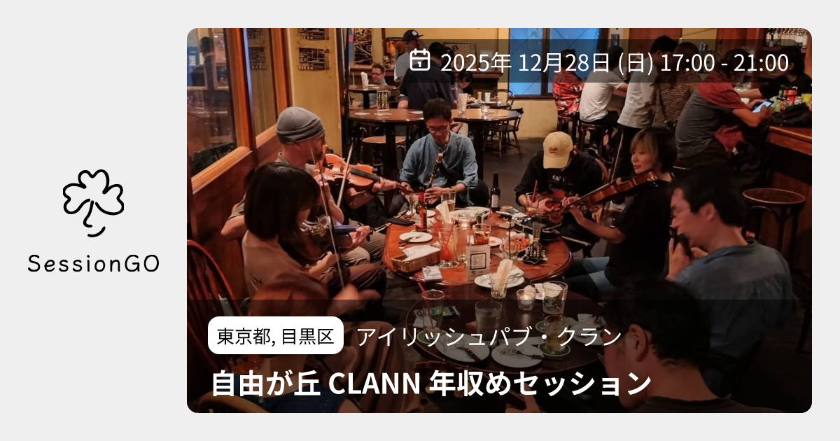 東京都, 目黒区アイリッシュパブ・クラン自由が丘 CLANN 年収めセッション2025年12月28日(日)終了8:00 - 12:00東京都目黒区自由が丘1丁目8−8−18主催者:曽武川のえる🔰 初心者歓迎12月 28日 17時から 自由が丘 CLANNで 年収めセッションが あります 都合が 良かったら是非 来てください Irish Music Session! 日時:12月28日(日)17:00 場所:CLANN(自由が丘) 東京都目黒区自由が丘1-8-18 ノーブルビル3F (東急東横線・大井町線 自由が丘駅 南口から徒歩2分) (03-3725-9116) https://tabelog.com/tokyo/A1317/A131703/13189406/ お時間のある方は、ぜひお出でください。 ギネスや料理も、美味しいですよ!! #CLANN #自由が丘 #irishmusicsessionイベント内容をコピーして新規投稿※閉店・移転などにより、正常に表示されない場合があります