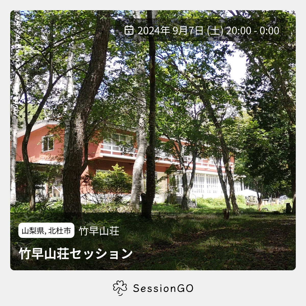 山梨県, 北杜市竹早山荘竹早山荘セッション2024年9月7日(土)終了11:00 - 15:00山梨県北杜市高根町清里3545−1 学校寮区主催者:八ヶ岳アイリッシュ音楽フェス🚭 開催場所が禁煙八ヶ岳アイリッシュ音楽フェスのお宿「竹早山荘」でのセッション 夜は肌寒いかもしれません。 フェス参加者以外の方は事前に連絡ください。 https://x.com/yatsugataketradイベント内容をコピーして新規投稿※閉店・移転などにより、正常に表示されない場合があります