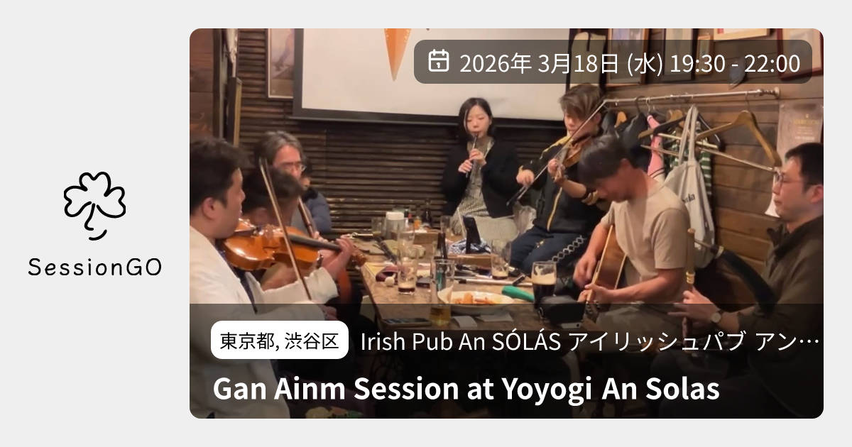 東京都, 渋谷区Irish Pub An SÓLÁS アイリッシュパブ アン ソラスGan Ainm Session at Yoyogi An Solas2026年3月18日(水)10:30 - 13:00東京都渋谷区千駄ケ谷5丁目22−3 都営千駄ヶ谷アパート 1号館 103号主催者:深江健一(ギター)/大渕 愛子(フィドル)🔰 初心者歓迎26年3月18日(水) 19:30頃〜 代々木An Solas 〒151-0051 Tokyo渋谷区千駄ヶ 谷5-22-3 ホスト: 深江健一(ギター)/大渕 愛子(フィドル)イベント内容をコピーして新規投稿※閉店・移転などにより、正常に表示されない場合があります