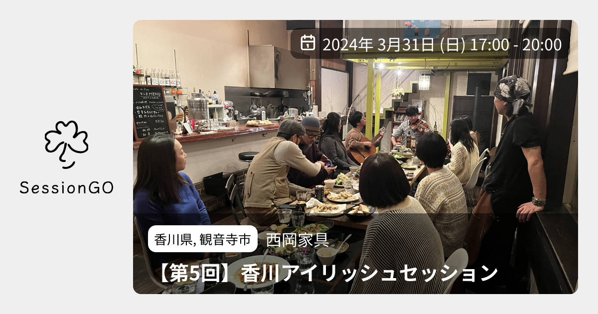 香川県, 観音寺市西岡家具【第5回】香川アイリッシュセッション2024年3月31日(日)終了8:00 - 11:00香川県観音寺市吉岡町770主催者:吉家🔰 初心者歓迎🚭 開催場所が禁煙🙋♀️ 事前申し込みが必要西岡家具 さんの奥に新店舗 "バルクヌート"さんがオープンします! そちらにて、17時からセッションをさせていただきます。 アップライトピアノがあり、ダンスもできます。 ぜひお越しください! ※写真は2/7の別の企画のものです。