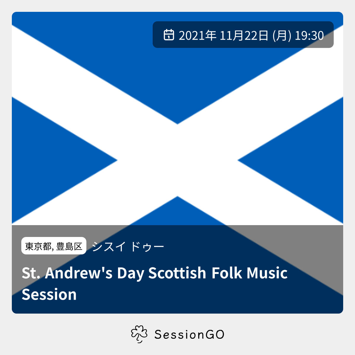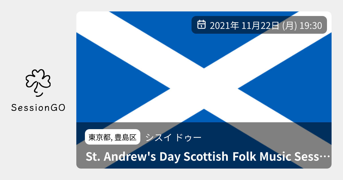 東京都, 豊島区シスイ ドゥーSt. Andrew's Day Scottish Folk Music Session2021年11月22日(月)終了10:30東京都豊島区南大塚1丁目60−20主催者:Wagtails🙋♀️ 事前申し込みが必要スコットランドの祝日セントアンドリュースデイを祝って、久しぶりにスコティッシュセッションを開催します。 お店では秋の味覚がたくさんそろってますので、お食事がてらお越し下さい。 ※感染症対策のため演奏者は事前連絡の方のみとさせていただきます。心置きなくオープンセッションができる日まで今しばらくお待ちください。 ※ミュージシャン席は満席となりました。リスナーの方はもちろんウェルカム!イベント内容をコピーして新規投稿※閉店・移転などにより、正常に表示されない場合があります