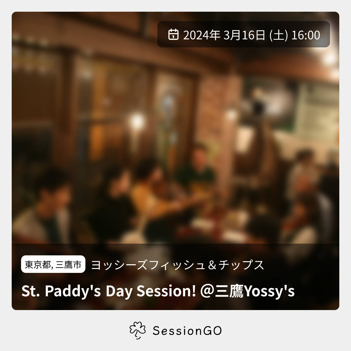 東京都, 三鷹市ヨッシーズフィッシュ&チップスSt. Paddy's Day Session! @三鷹Yossy's 2024年3月16日(土)終了7:00東京都三鷹市下連雀3丁目34−14主催者:Alecks, Sam🚭 開催場所が禁煙Happy St. Paddy's Day!! 絶品のフィッシュ&チップスとビールと音楽で、センパトウィークエンドを楽しみましょう♪ 2024年3月16日(土) 16:00〜 @ 三鷹 ヨッシーズ フィッシュ&チップス https://www.instagram.com/yossys_fc?igshid=OGQ5ZDc2ODk2ZA== ホスト: Alecks, Sam ※一部参加、聴くだけ、食べるだけ、呑むだけの方も歓迎です。 ※店内座席に限りがあり、また一般のお客様もいらっしゃいます。混雑状況に応じ、お互いにリスペクトし合い共存しながら楽しみましょう。 ※体調不良なかたは来店をお控え願います。感染対策にご協力ください。イベント内容をコピーして新規投稿※閉店・移転などにより、正常に表示されない場合があります