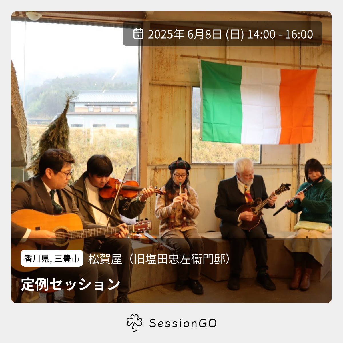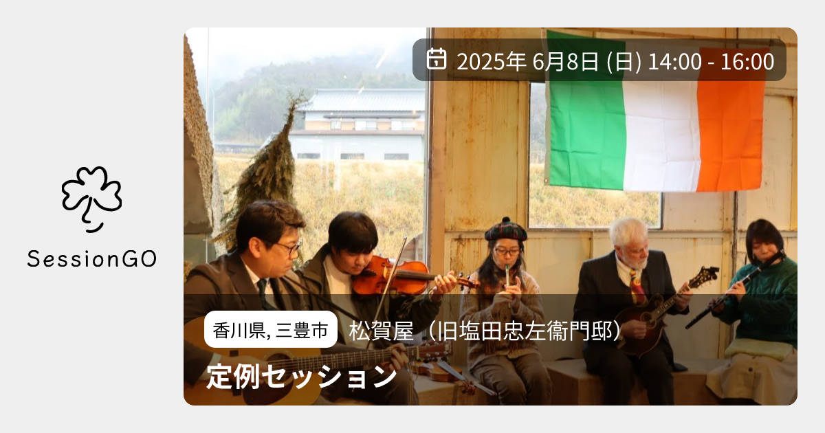 香川県, 三豊市松賀屋(旧塩田忠左衞門邸)定例セッション2025年6月8日(日)終了5:00 - 7:00香川県三豊市仁尾町仁尾丁980 980番地主催者:アイリッシュミュージックin香川🙋♀️ 事前申し込みが必要🔒 クローズドセッション🔰 初心者歓迎🙏 投げ銭お願いします【定例セッション】 香川県三豊市の立派な日本家屋の松賀屋さんにて、クローズドのセッションを行います! お菓子や飲み物の販売もあります😋 セッション終了後に父母が浜に寄ればきれいな夕陽が見られるかも! 参加されたい方は連絡ください😊 よろしくお願いします🙇イベント内容をコピーして新規投稿※閉店・移転などにより、正常に表示されない場合があります