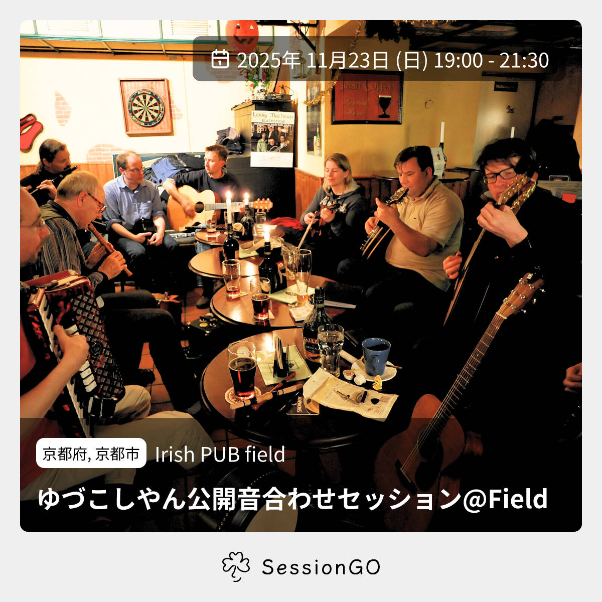 京都府, 京都市Irish PUB fieldゆづこしやん公開音合わせセッション@Field2025年11月23日(日)終了10:00 - 12:30京都府京都市中京区元法然寺町683 錦ビル 烏丸 2F・3F主催者:Kossy(fiddle),ゆづ(guitar)🎙️ ライブ急遽開催。 19:00〜20:00 公開音合わせという名のデュオライブです。おもにアイリッシュたまにスコティッシュ。 20:00〜21:30 フリーセッションイベント内容をコピーして新規投稿参加者✋ 参加予定(0)🤔 行けたら行く(0)👀 興味あり(0)🙅 キャンセル(0)