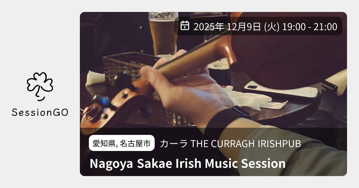 愛知県, 名古屋市カーラ THE CURRAGH IRISHPUBNagoya Sakae Irish Music Session2025年12月9日(火)終了10:00 - 12:00愛知県名古屋市中区錦3丁目16−8 森万ビル B1主催者:名古屋アイリッシュ音楽サークルBanna Beag🔰 初心者歓迎One drink is required to order.イベント内容をコピーして新規投稿※閉店・移転などにより、正常に表示されない場合があります