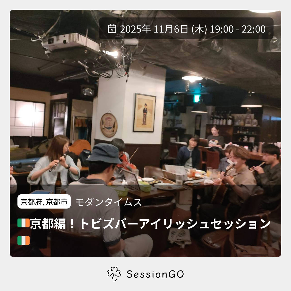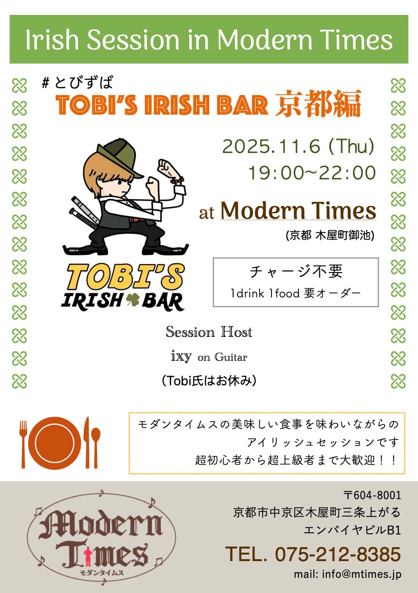 京都府, 京都市モダンタイムス🇮🇪京都編!トビズバーアイリッシュセッション🇮🇪2025年11月6日(木)終了10:00 - 13:00京都府京都市中京区木屋町 三条上がるエンパイヤビルB1主催者:いくしまぶちょー🔰 初心者歓迎いつも大阪京橋でやっているトビさん主催のアイリッシュセッション「とびずばー」 今回は京都木屋町へ出張!2回目!😁 ※ トビさんは今回不在なのでフランチャイズとびずば😁笑 モダンタイムスさんのお料理食べながら、アイリッシュセッション楽しみましょう💓 (tobiさんの特別料理は京橋のみ〜) 【とびずばーin京都】 11/6(木)19〜22時 ホスト🇮🇪生島ぶちょー ギター🎸生島ぶちょー 料金🇮🇪チャージ不要、1ドリンク1フードOrder必要 初心者さん〜超上級者さん誰でも大歓迎です!✨️ 聞き専さんもお待ちしてまーす! お気軽に遊びに来てくださいねーっ😁イベント内容をコピーして新規投稿※閉店・移転などにより、正常に表示されない場合があります