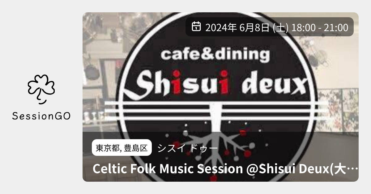 東京都, 豊島区シスイ ドゥーCeltic Folk Music Session @Shisui Deux(大塚)2024年6月8日(土)終了9:00 - 12:00東京都豊島区南大塚1丁目60−20−919主催者:Ryza & Yu🔰 初心者歓迎アイリッシュとスコティッシュ中心のセッションです。北欧やフランス、ベルギーなど、他の国の音楽も歓迎。 おいしい料理がたくさんあります。夜ご飯がてらお越しください。 お店の営業時間 Restaurant Hours 17:00-23:00(ラストオーダー22:30) https://www.facebook.com/Shisuideux/ セッションタイム Music Session Hours 18:00-21:00 ※演奏者以外のお客様のオーダー・ご歓談のため、途中20分程度の休憩が入ります。あらかじめご了承ください。休憩中は楽器はお休みください。イベント内容をコピーして新規投稿※閉店・移転などにより、正常に表示されない場合があります