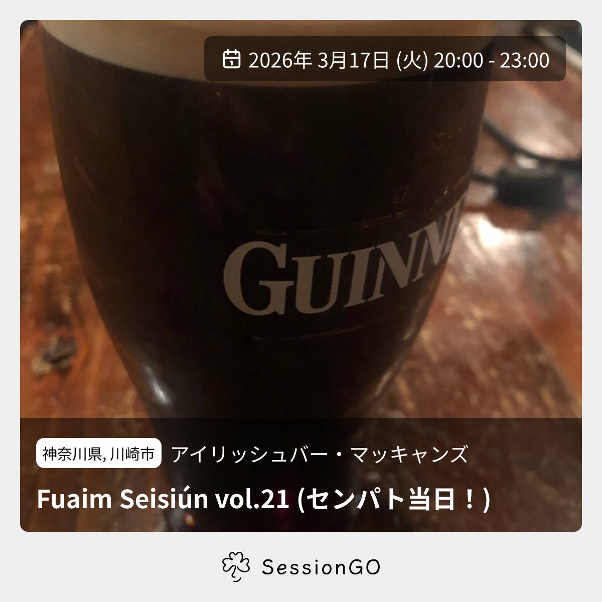 神奈川県, 川崎市アイリッシュバー・マッキャンズFuaim Seisiún vol.21 (センパト当日!)2026年3月17日(火)11:00 - 14:00神奈川県川崎市中原区新丸子東2丁目926−27 IRISH BAR McCANN’S主催者:福島開 中林亮 内藤徹也 大越俊輔参加申込みページへ🔰 初心者歓迎学生時代から仲良くしているメンバーでセッションを開催します(セッション開催を許諾してくださったマッキャンズ様、ありがとうございます)。今回は21回目!なんとセンパト当日です! どなたでも歓迎です。もしよろしければ、ぜひたくさん飲み食いしていってください。 参加予定はこちら▼ https://www.facebook.com/share/1CeShagn9b/?mibextid=wwXIfrイベント内容をコピーして新規投稿※閉店・移転などにより、正常に表示されない場合があります
