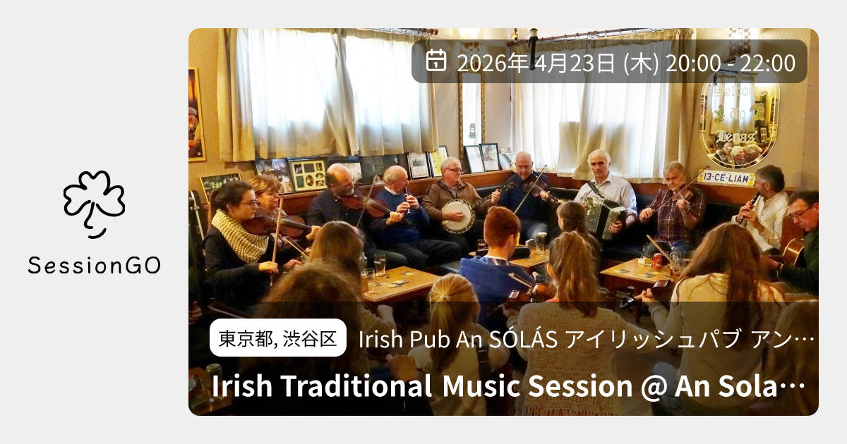 東京都, 渋谷区Irish Pub An SÓLÁS アイリッシュパブ アン ソラスIrish Traditional Music Session @ An Solas Yoyogi Tokyo2026年4月23日(木)11:00 - 13:00東京都渋谷区千駄ケ谷5丁目22−3 都営千駄ヶ谷アパート 1号館 103号🔰 初心者歓迎アイリッシュ音楽セッション @ 代々木アイリッシュパブ アン ソラス 日時: 2026年04月23日(木) 20:00~22:00 場所: Irish Pub An SÓLÁS (アイリッシュパブ アン ソラス) (代々木駅近く) 住所: 東京都渋谷区千駄ヶ谷5-22-3 都営住宅千駄ヶ谷アパート1号館103号 電話: 03-5919-6686 https://instagram.com/an_solas/ 自由参加のオープンセッションですイベント内容をコピーして新規投稿※閉店・移転などにより、正常に表示されない場合があります