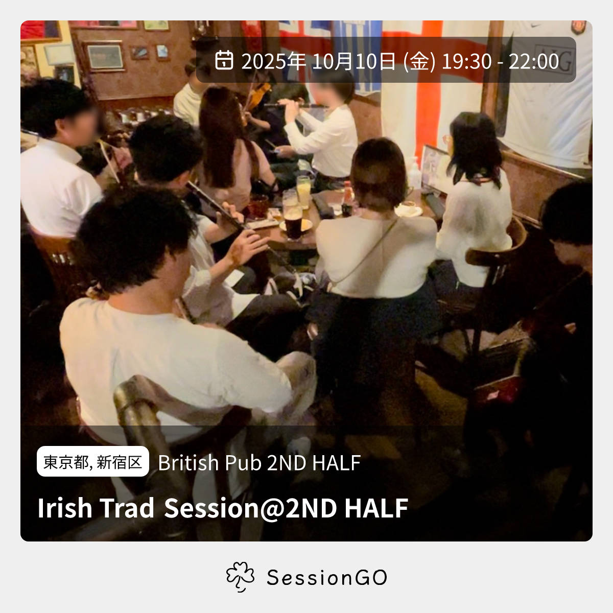 東京都, 新宿区British Pub 2ND HALFIrish Trad Session@2ND HALF2025年10月10日(金)終了10:30 - 13:00東京都新宿区高田馬場3丁目2主催者:まさと, かまわぬ🔰 初心者歓迎アイリッシュが中心のトラッドセッションです! 参加費は無料ですが、1人あたり2オーダー以上の注文をお願いします。酒もご飯も美味しいお店です。 店内にギターと電子ピアノもありますので、伴奏の方も気軽にご参加ください。 今回は申し込み不要ですので、フラッとお気軽にお越しください! ## ホスト まさと: コンサティーナ かまわぬ: フルート https://sites.google.com/view/2nd-half-sessionイベント内容をコピーして新規投稿※閉店・移転などにより、正常に表示されない場合があります