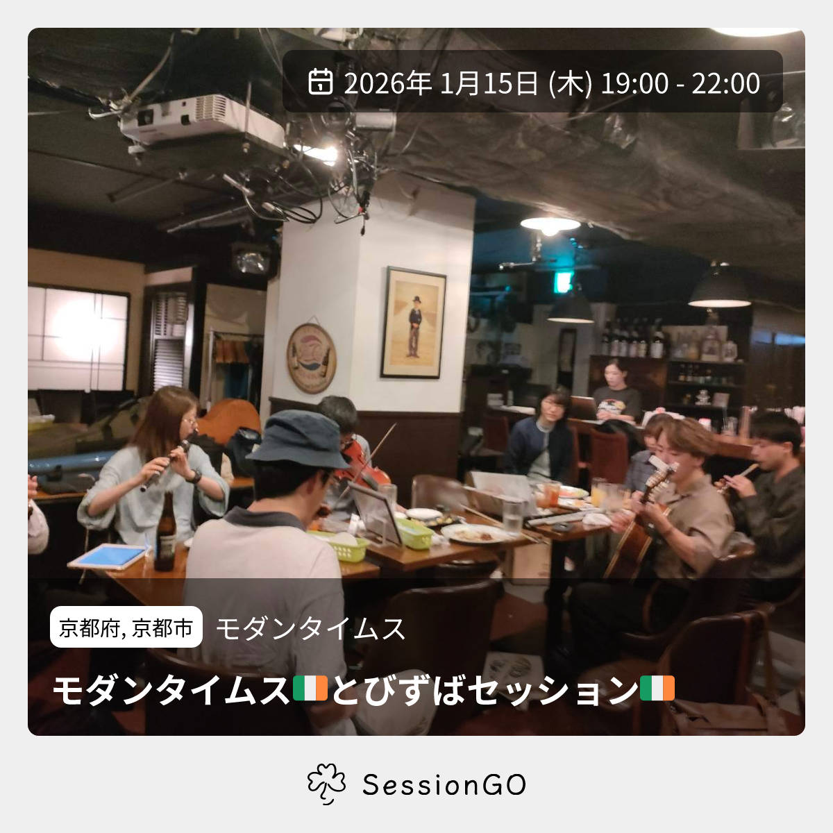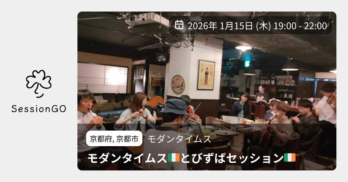 京都府, 京都市モダンタイムスモダンタイムス🇮🇪とびずばセッション🇮🇪2026年1月15日(木)終了10:00 - 13:00京都府京都市中京区木屋町 三条上がるエンパイヤビルB1主催者:トビさん&ぶちょー🔰 初心者歓迎いつも大阪京橋でやっているトビさん主催のアイリッシュセッション「とびずばー」 京都木屋町モダンタイムスさんも毎月安定開催になってきました❇️ 2026/1/15(木) 19-22時開催です! モダンタイムスさんのお料理食べながら、アイリッシュセッション楽しみましょう💓 (tobiさんの特別料理は京橋のみ〜) 【とびずばーin京都】 11/6(木)19〜22時 ホスト🇮🇪トビさん&ぶちょー ギター🎸生島ぶちょー 料金🇮🇪チャージ不要、1フード1ドリンクOrder必要 初心者さん〜超上級者さん誰でも大歓迎です!✨️ 聞き専さんもお待ち してまーす! お気軽に遊びに来てくださいねーっ😁イベント内容をコピーして新規投稿※閉店・移転などにより、正常に表示されない場合があります