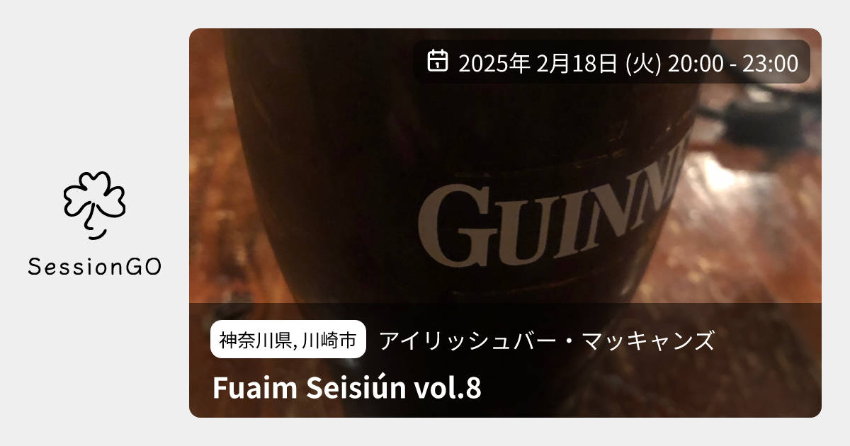 神奈川県, 川崎市アイリッシュバー・マッキャンズFuaim Seisiún vol.82025年2月18日(火)終了11:00 - 14:00神奈川県川崎市中原区新丸子東2丁目926−27 IRISH BAR McCANN’S主催者:中林亮 福島開 内藤徹也 大越俊輔🔰 初心者歓迎学生時代から仲良くしているメンバーでセッションを開催します(セッション開催を許諾してくださったマッキャンズ様、ありがとうございます)。今回は8回目です。 どなたでも歓迎です。もしよろしければ、ぜひたくさん飲み食いしていってください。 参加予定はこちら▼ https://www.facebook.com/share/19jZJYLLYq/?mibextid=wwXIfrイベント内容をコピーして新規投稿※閉店・移転などにより、正常に表示されない場合があります