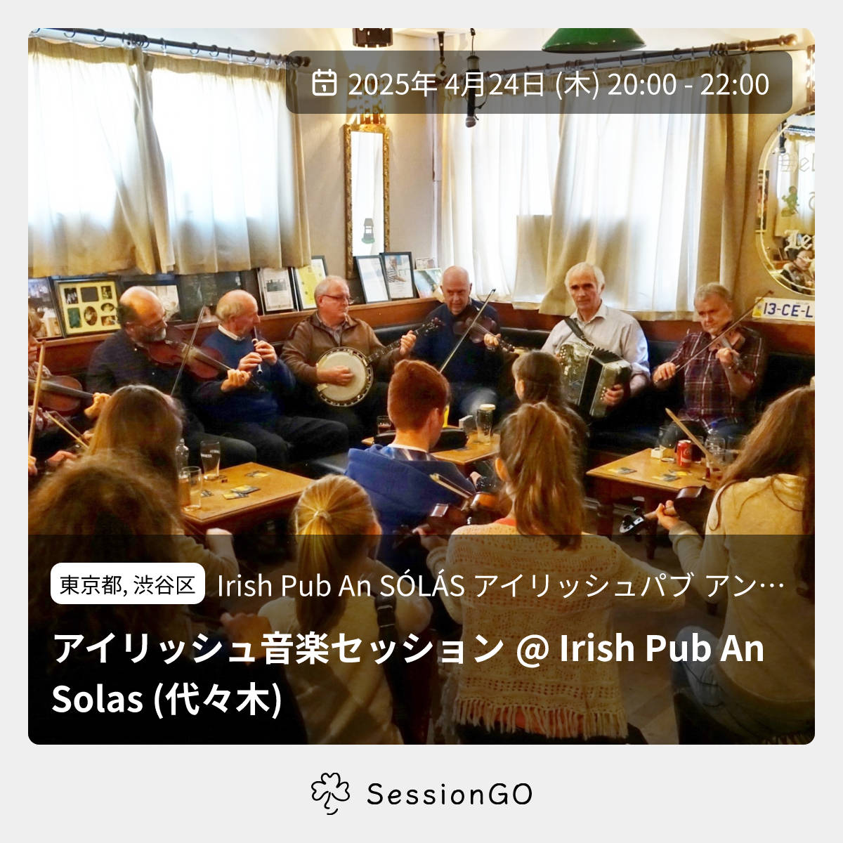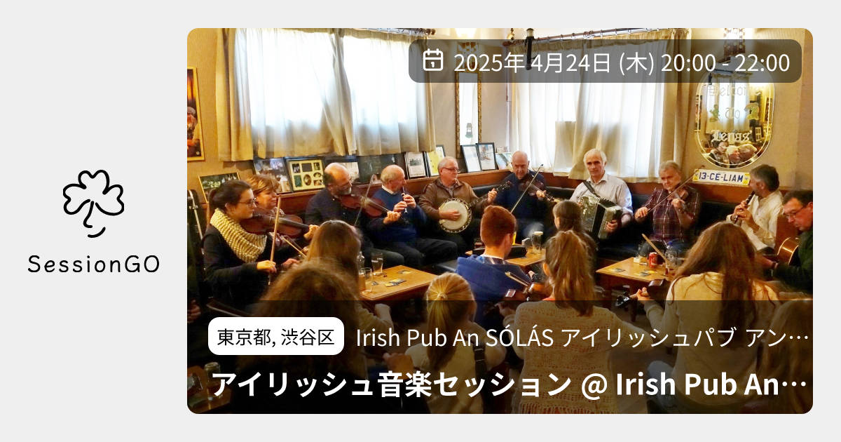 東京都, 渋谷区Irish Pub An SÓLÁS アイリッシュパブ アン ソラスアイリッシュ音楽セッション @ Irish Pub An Solas (代々木)2025年4月24日(木)終了11:00 - 13:00東京都渋谷区千駄ケ谷5丁目22−3 都営千駄ヶ谷アパート 1号館 103号【アイリッシュ音楽セッションのお知らせ】 日時: 2025年4月24日(木) 20:00~22:00 場所: Irish Pub An SÓLÁS (アイリッシュパブ アン ソラス) 住所: 東京都渋谷区千駄ヶ谷5-22-3 都営住宅千駄ヶ谷アパート1号館103号 電話: 03-5919-6686 https://instagram.com/an_solas/ 自由参加のオープンセッションです。イベント内容をコ ピーして新規投稿※閉店・移転などにより、正常に表示されない場合があります