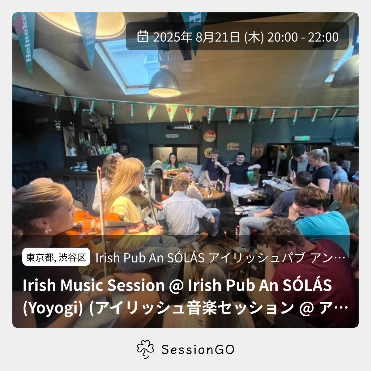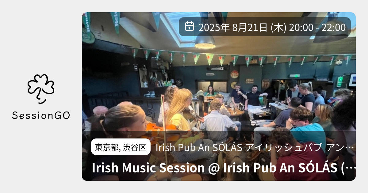 このイベントは終了していますが、同じ場所でこんなイベントも予定されています2026/3/18(水)10:30-13:00Gan Ainm Session at Yoyogi An Solas東京渋谷区Irish Pub An SÓLÁS アイリッシュパブ アン ソラス2026/3/24(火)10:00-13:00Irish Music Session Vol.171 at Yoyogi Tokyo東京渋谷区Irish Pub An SÓLÁS アイリッシュパブ アン ソラス2026/4/28(火)10:00-13:00Irish music Session Vol.172 at Yoyogi, Tokyo東京渋谷区Irish Pub An SÓL ÁS アイリッシュパブ アン ソラス2026/5/26(火)10:00-13:00Irish Music Session Vol.173 at Yoyogi, Tokyo東京渋谷区Irish Pub An SÓLÁS アイリッシュパブ アン ソラス東京都, 渋谷区Irish Pub An SÓLÁS アイリッシュパブ アン ソラスIrish Music Session @ Irish Pub An SÓLÁS (Yoyogi) (アイリッシュ音楽セッション @ アイリッシュパブアンソラス)2025年8月21日(木)終了11:00 - 13:00東京都渋谷区千駄ケ谷5丁目22−3 都営千駄ヶ谷アパート 1号館 103号🔰 初心者歓迎【セッションのお知らせ(2025年8月21日木曜)】 2025年8月21日(木曜日)、代々木のアンソラスでセッションがあります。 自由参加のオープンセッションです。 日時: 2025年8月21日(木曜日) 20時~22時 場所: Irish Pub An SÓLÁS (アイリッシュパブ アン ソラス) 住所: 〒151-0051 東京都渋谷区千駄ヶ谷5丁目22−3 都営住宅千駄ヶ谷アパート1号館103号 ℡: 03-5919-6686 イベント内容をコピーして新規投稿※閉店・移転などにより、正常に表示されない場合があります