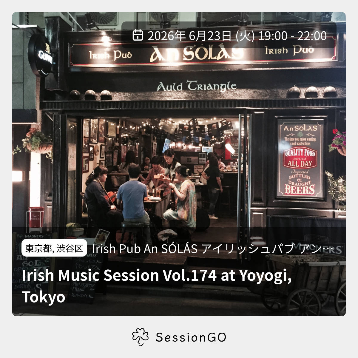 東京都, 渋谷区Irish Pub An SÓLÁS アイリッシュパブ アン ソラスIrish Music Session Vol.174 at Yoyogi, Tokyo2026年6月23日(火)10:00 - 13:00東京都渋谷区千駄ケ谷5丁目22−3 都営千駄ヶ谷アパート 1号館 103号主催者:Hiroshi Hasegawa🔰 初心者歓迎🚭 開催場所が禁煙代々木のアイリッシュパブ「An SÓLÁS(アンソラス)」のセッションのご案内です。皆様の参加・ご来店をお心より待ちしております。イベント内容をコピーして新規投稿※閉店・移転などにより、正常に表示されない場合があります