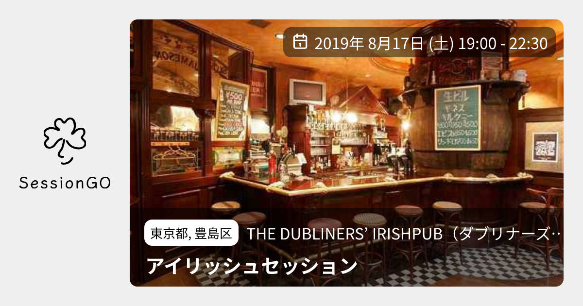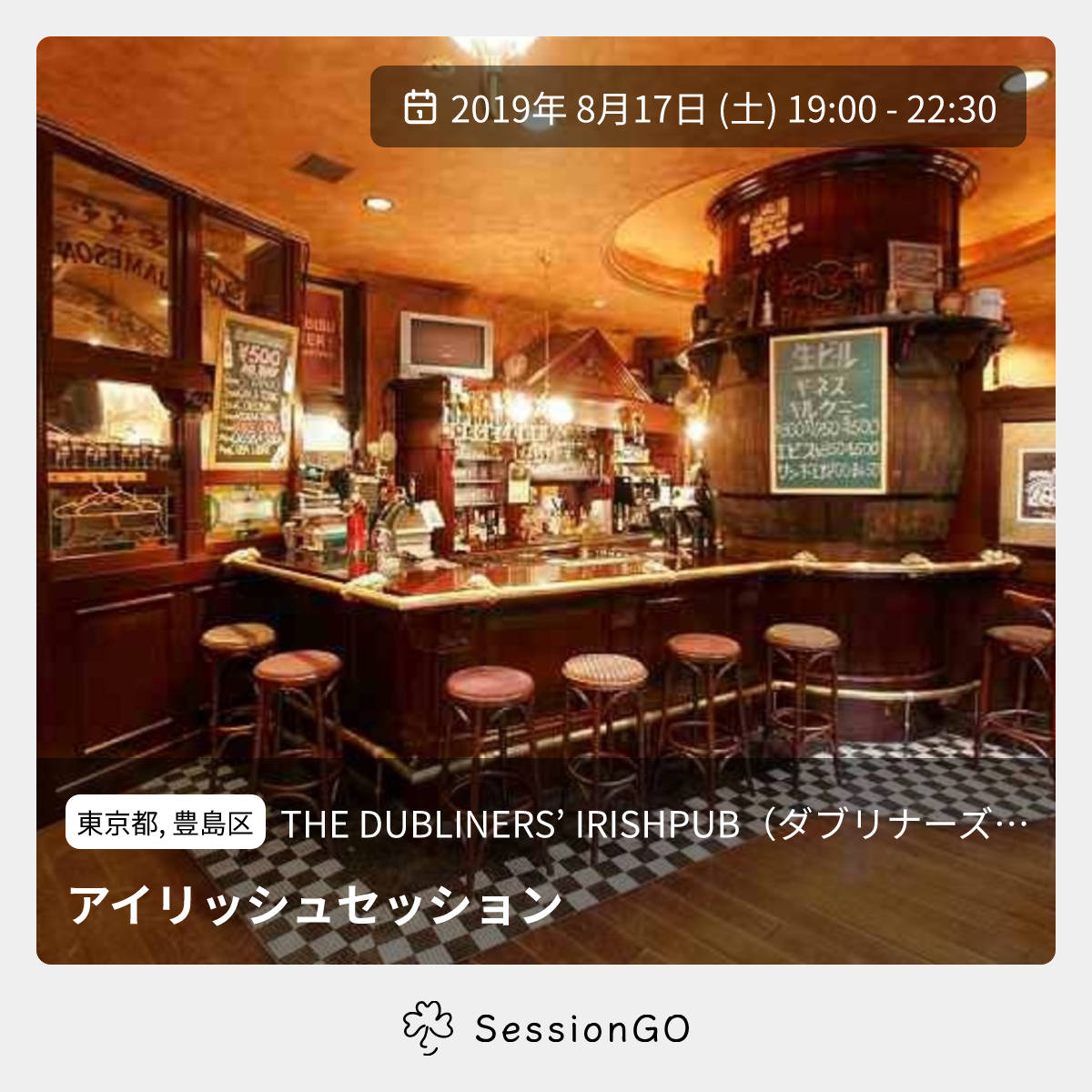 東京都, 豊島区THE DUBLINERS’ IRISHPUB(ダブリナーズ アイリッシュパブ) 池袋店アイリッシュセッション2019年8月17日(土)終了10:00 - 13:30東京都豊島区西池袋1丁目10−8主催者:稲葉聡🔰 初心者歓迎🚭 開催場所が禁煙アイリッシュ初心者、リスナーの方々も歓迎致します。 店内は広く、禁煙なのでクリーンな環境で楽しめます。イベント内容をコピーして新規投稿※閉店・移転などにより、正常に表示されない場合があります